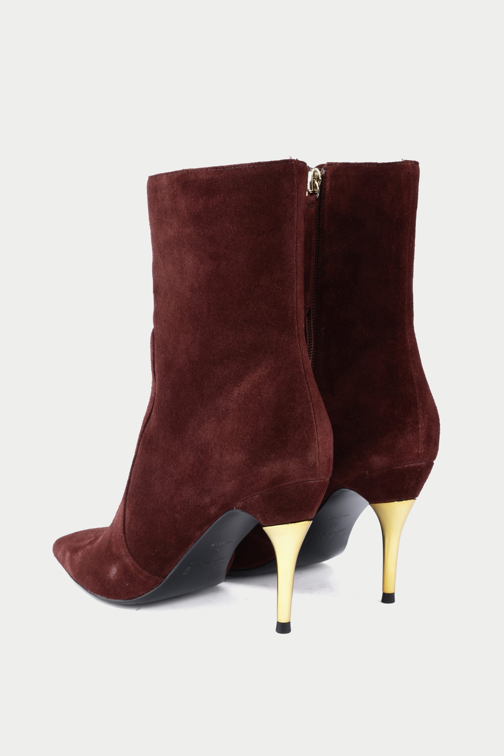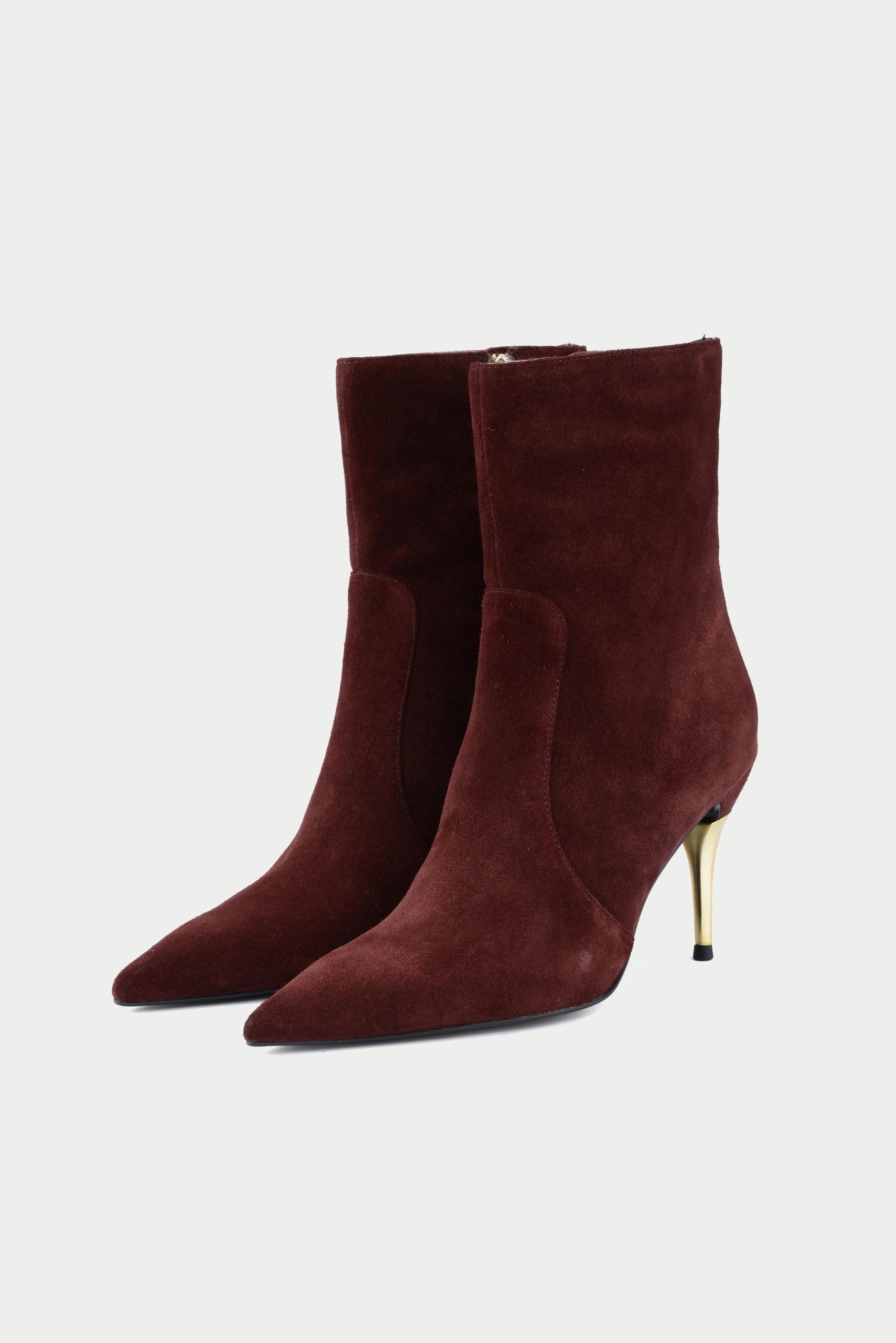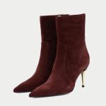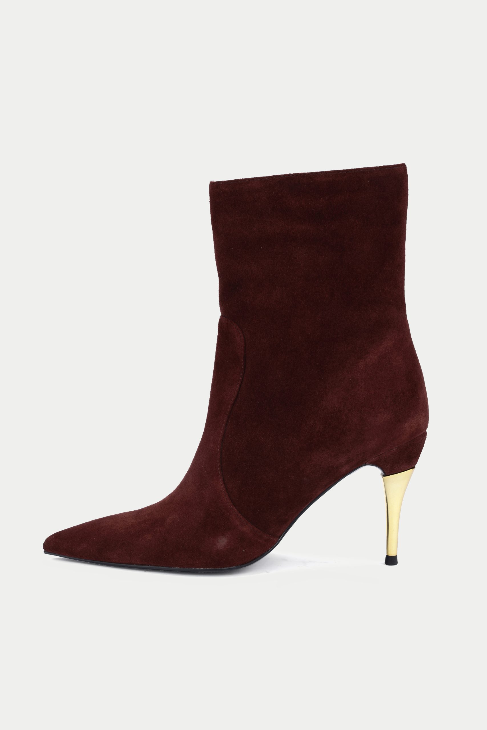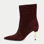 The Biella, a stylish and versatile ankle boot that effortlessly combines comfort and elegance. The rich burgundy suede upper adds a touch of sophistication, while the pointed toe and stiletto heel create a modern and feminine silhouette. The gold-toned heel adds a touch of luxury, making the Biella the perfect choice for elevating your winter wardrobe.