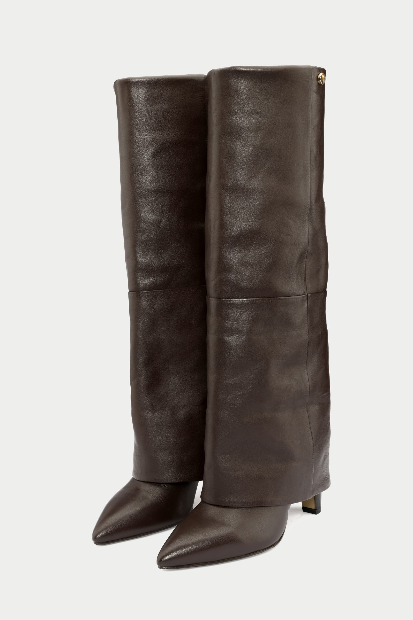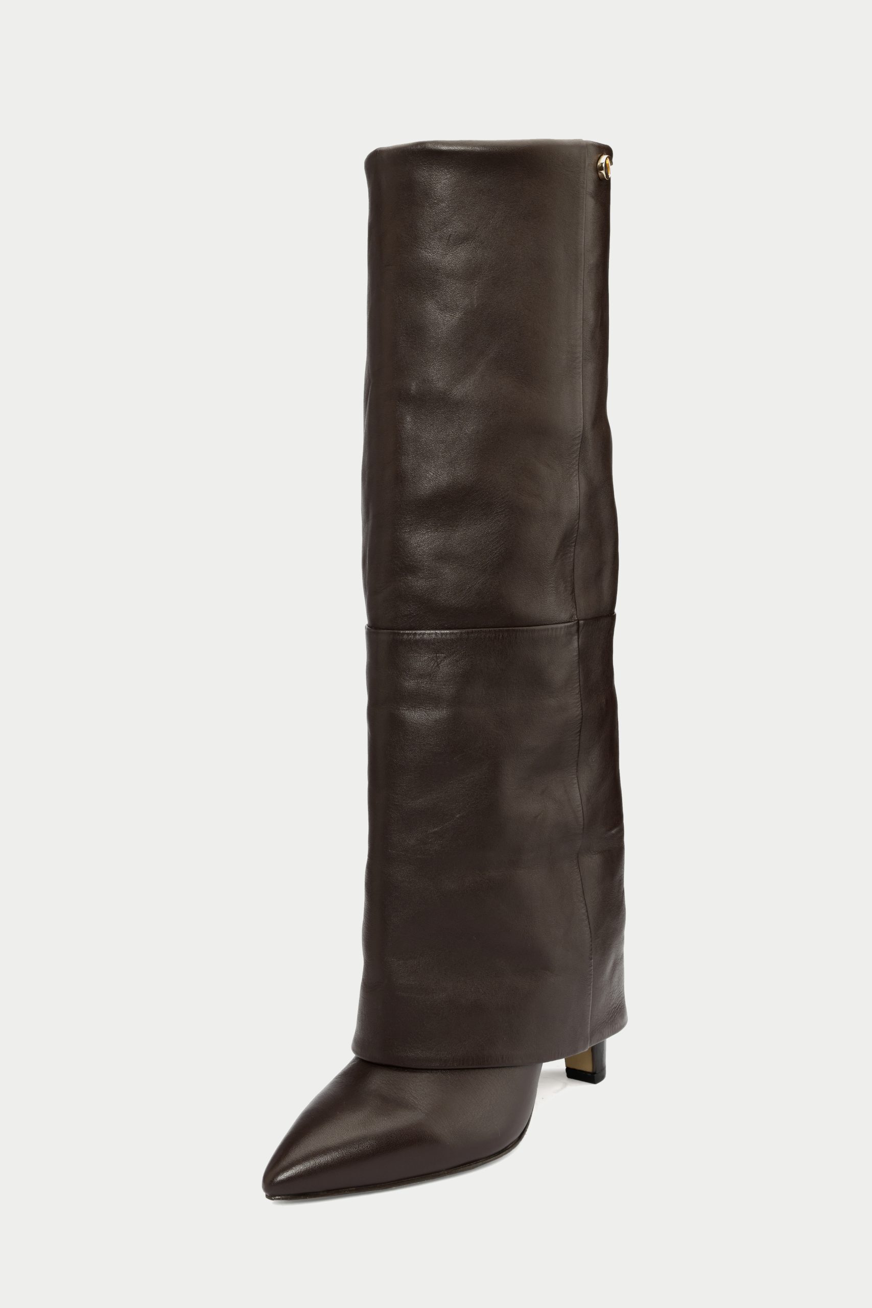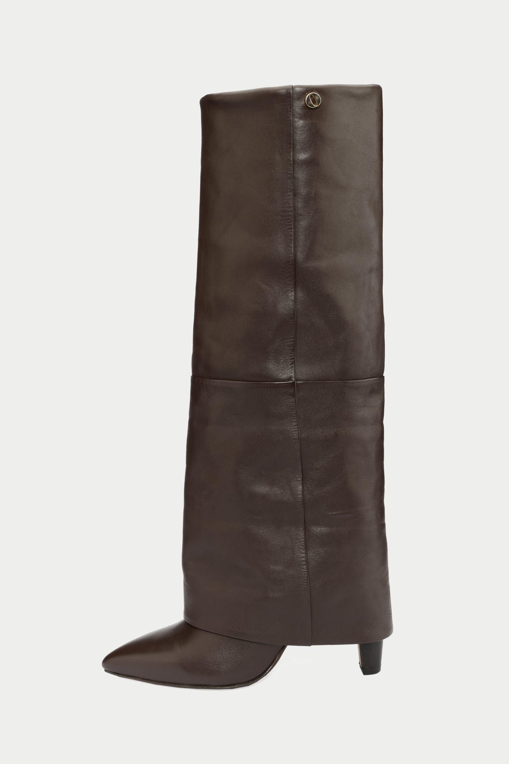 Elevate your winter wardrobe with the Mantua, a bold and statement-making over-the-knee boot. Crafted from rich brown leather, the Mantua features a unique folded design that adds a touch of edgy sophistication. The pointed toe and block heel create a striking silhouette, while the comfortable fit ensures all-day wearability. The Mantua is perfect for adding a touch of drama to your winter outfits.