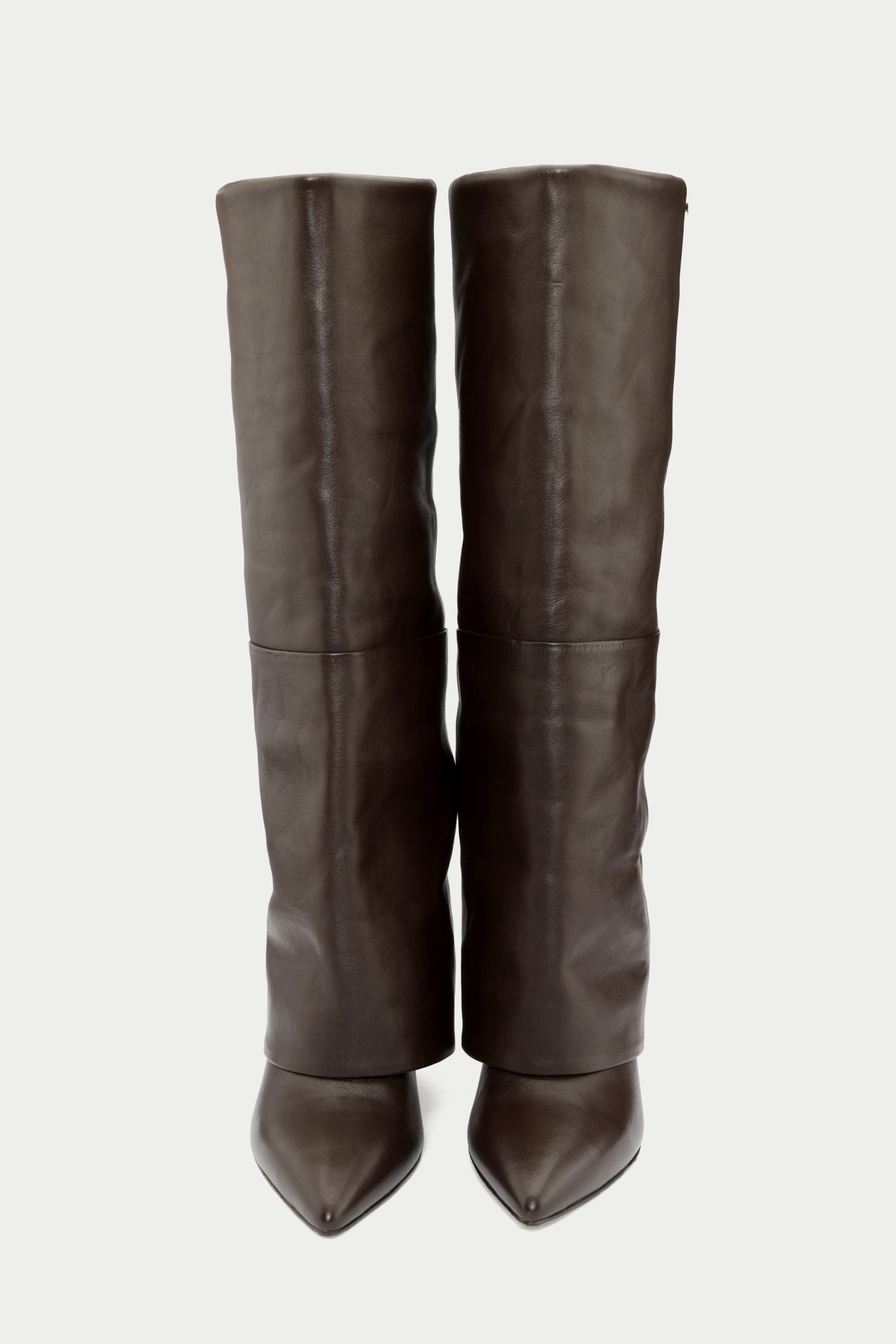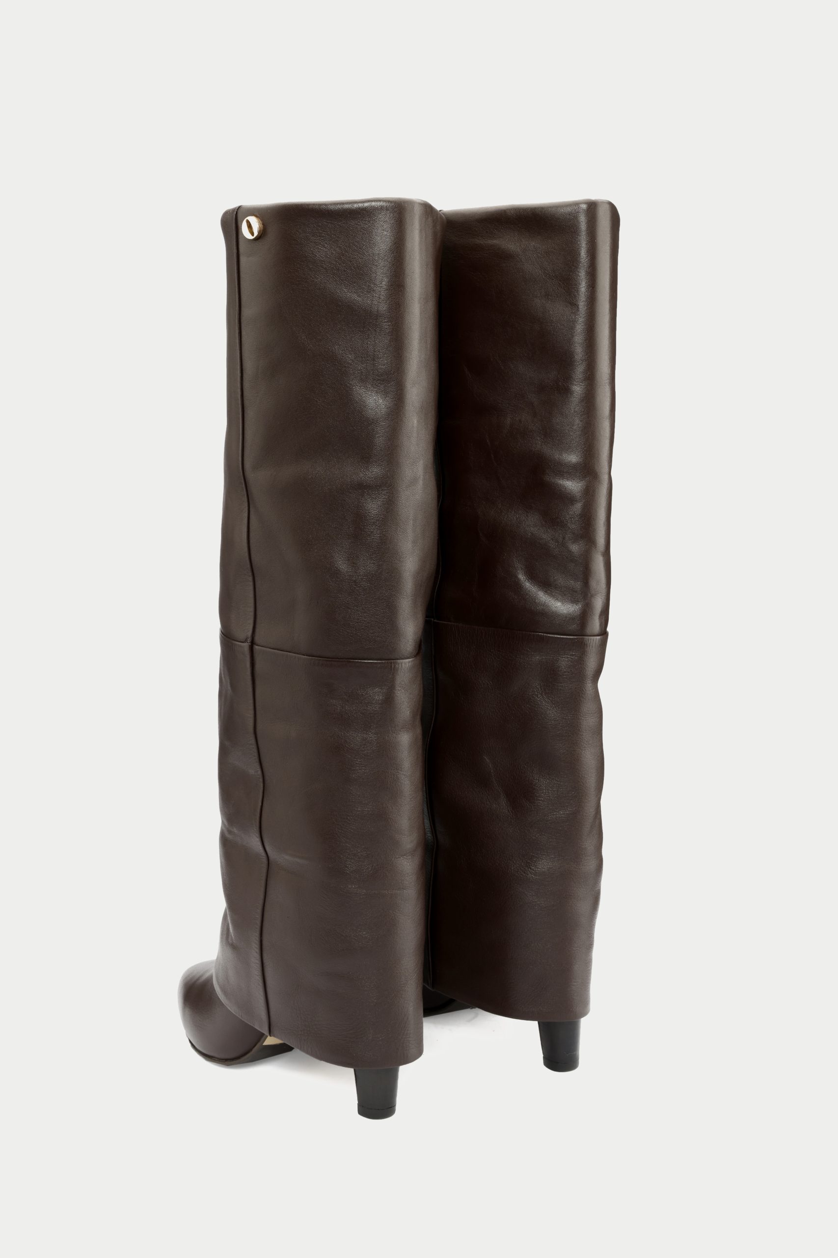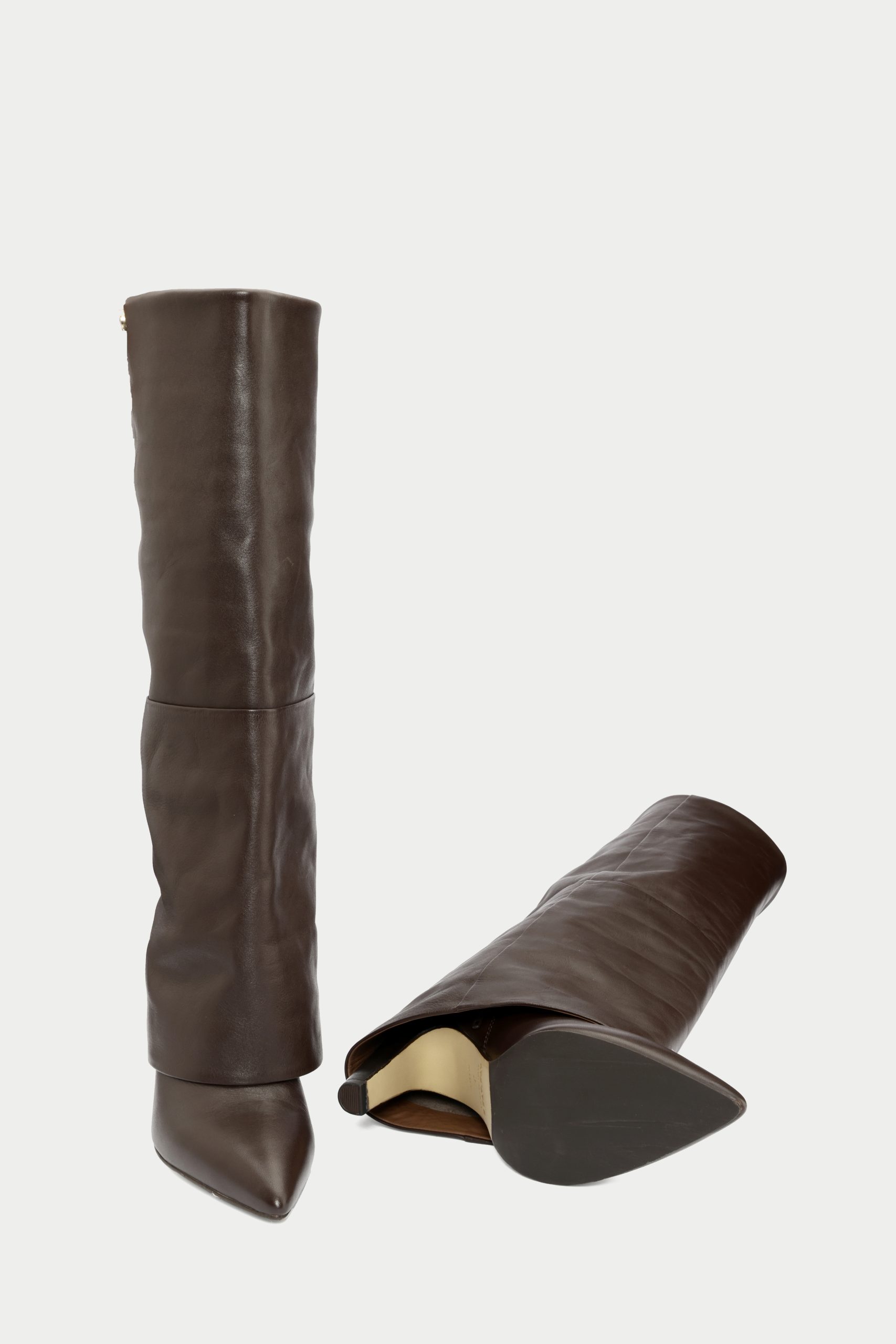 Elevate your winter wardrobe with the Mantua, a bold and statement-making over-the-knee boot. Crafted from rich brown leather, the Mantua features a unique folded design that adds a touch of edgy sophistication. The pointed toe and block heel create a striking silhouette, while the comfortable fit ensures all-day wearability. The Mantua is perfect for adding a touch of drama to your winter outfits.