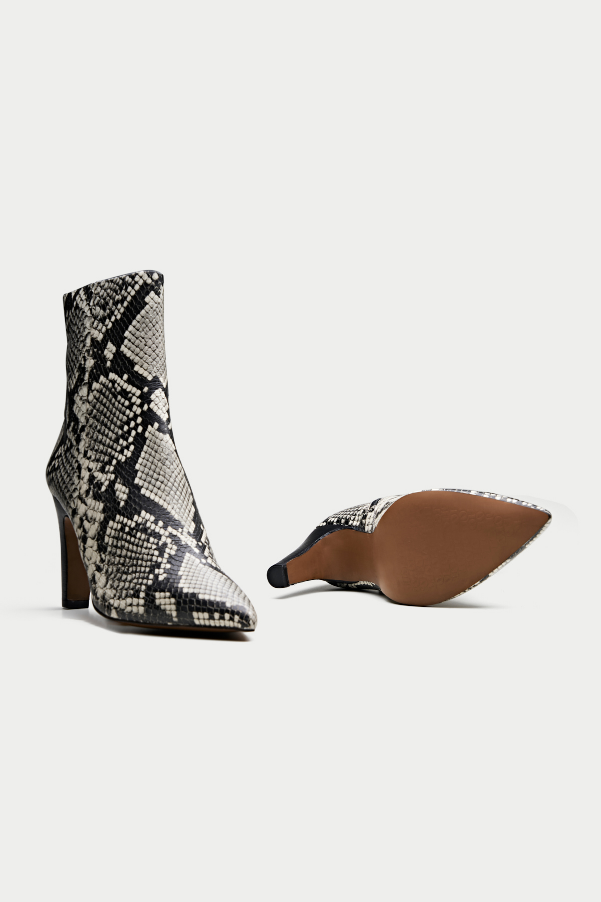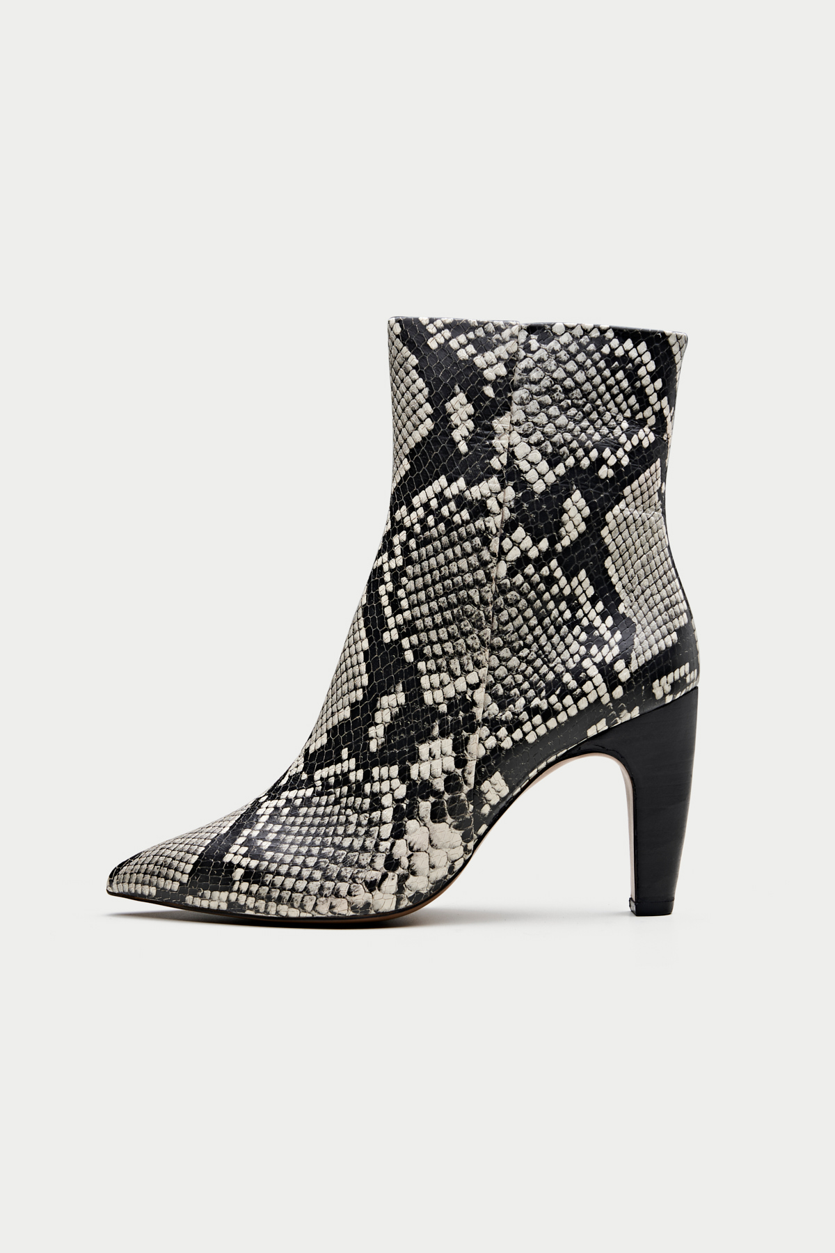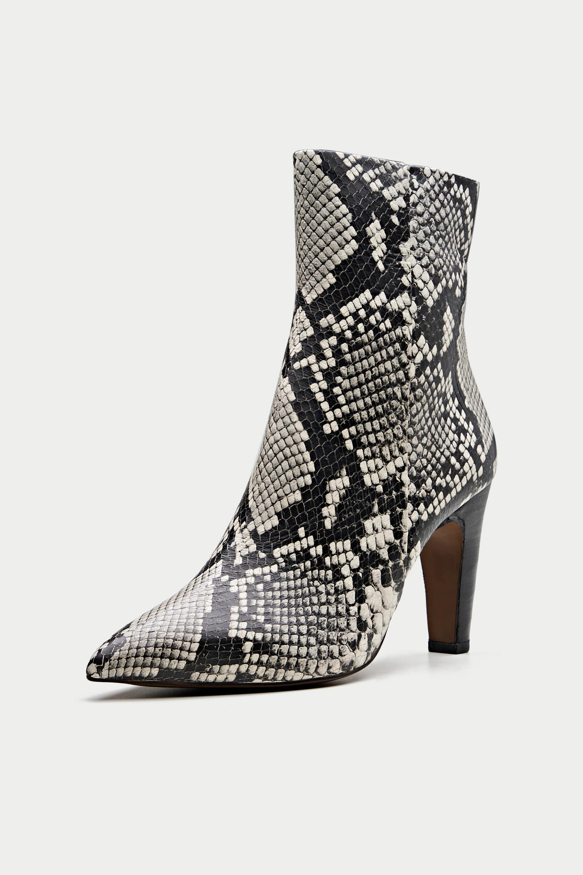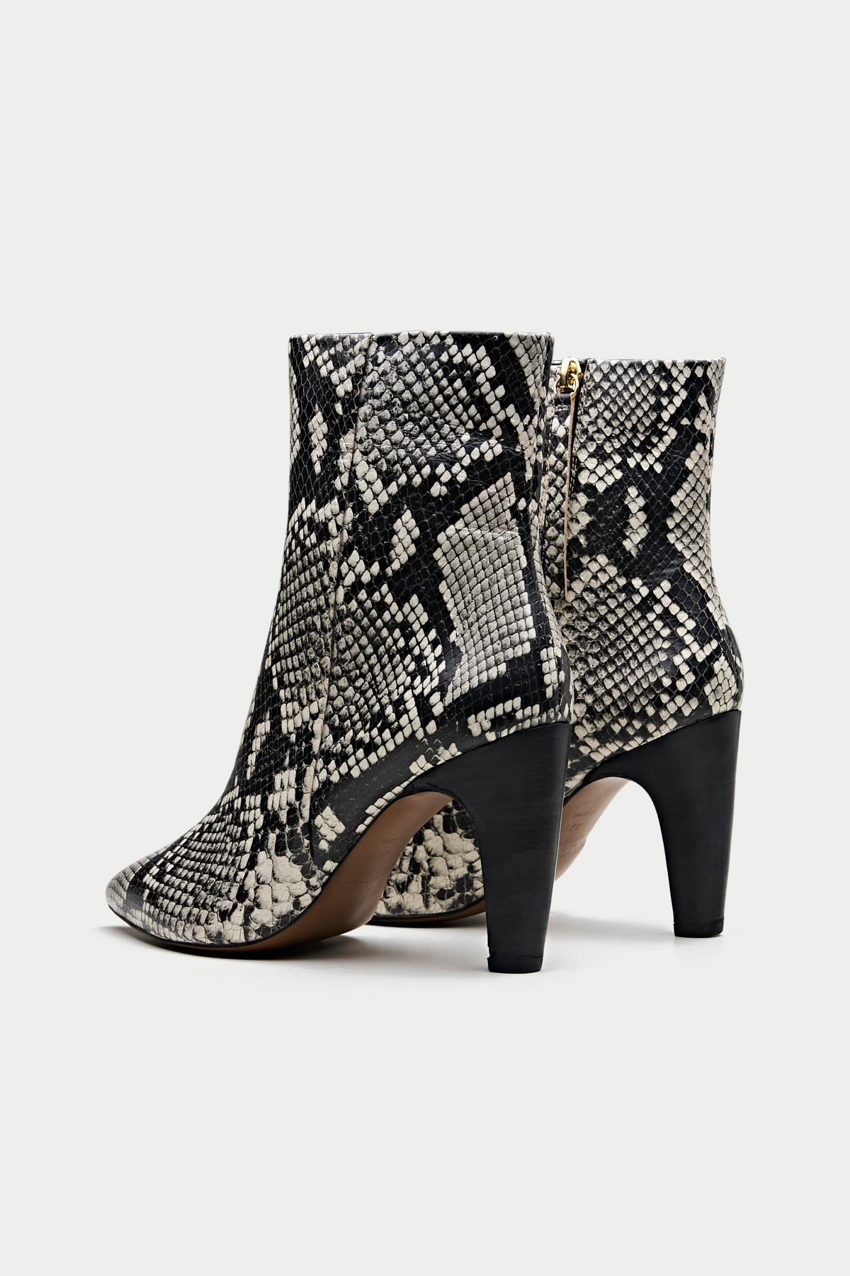 The Tortona, a bold and eye-catching ankle boot that adds a touch of animalistic flair to your wardrobe. The striking snake-print pattern creates a dramatic and stylish effect, while the pointed toe and block heel add a modern twist. The Tortona is the perfect choice for those who want to make a statement and stand out from the crowd.