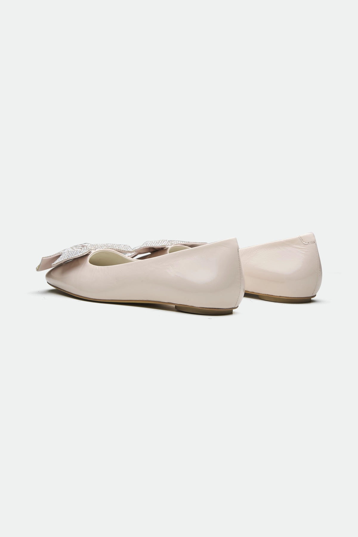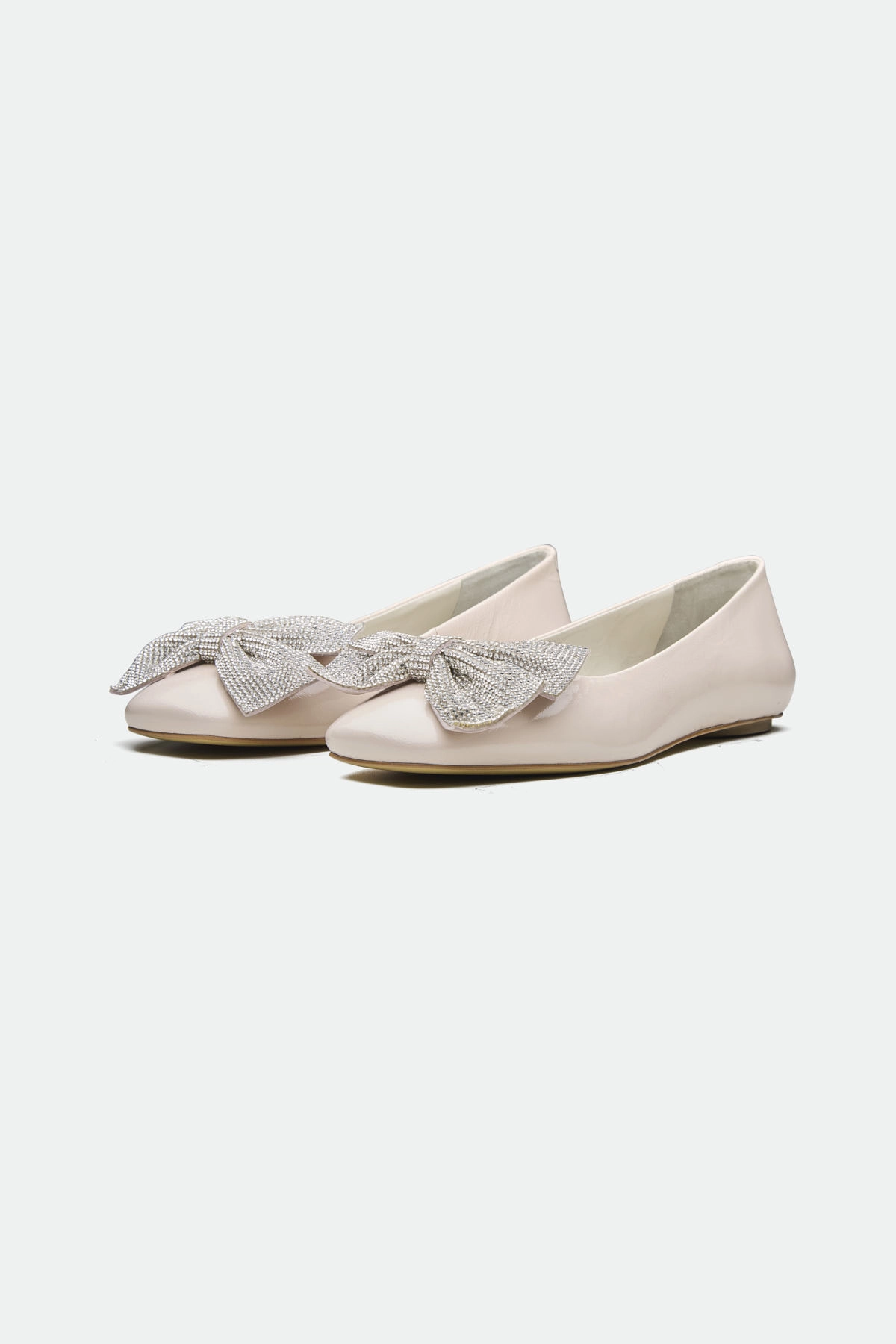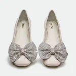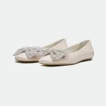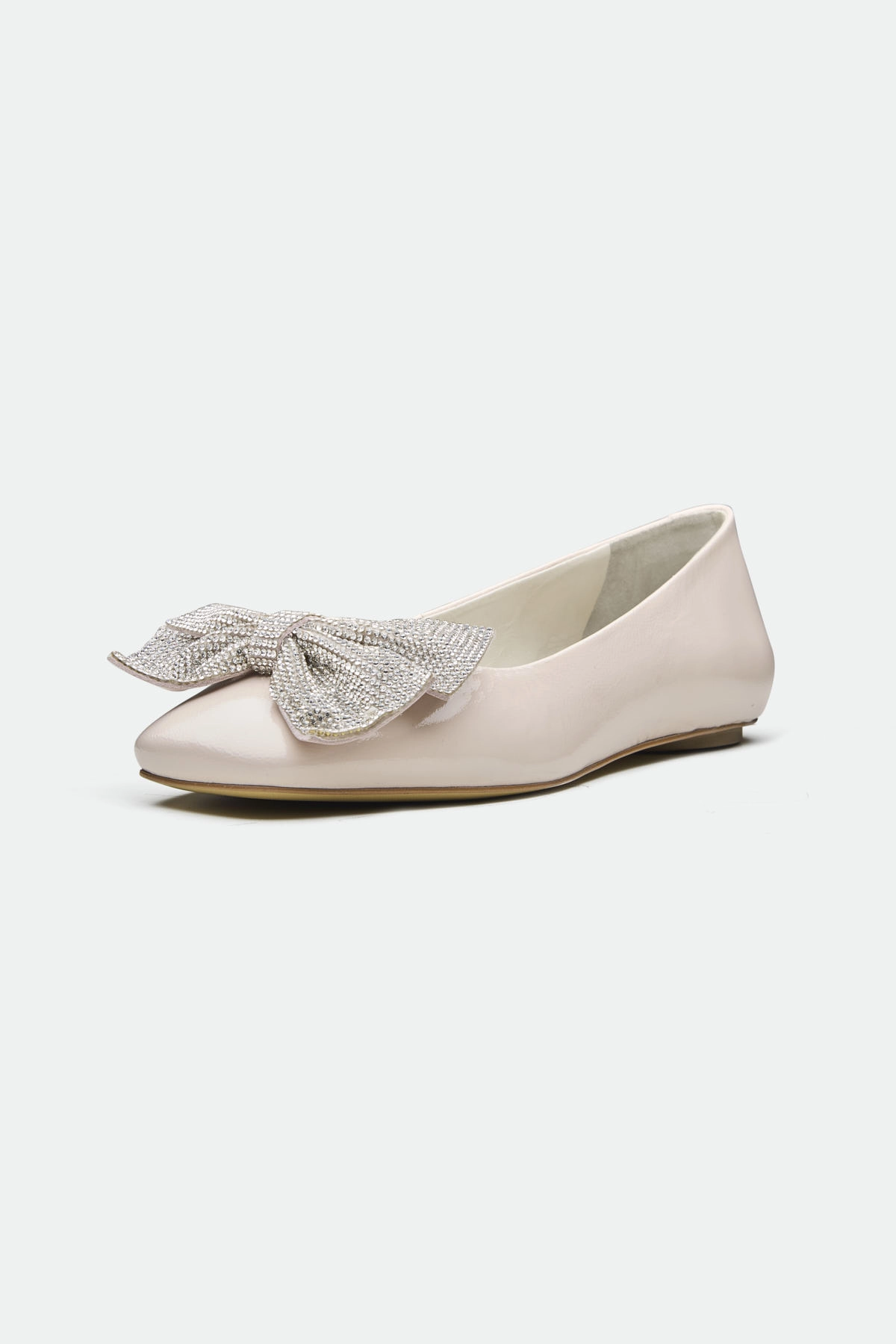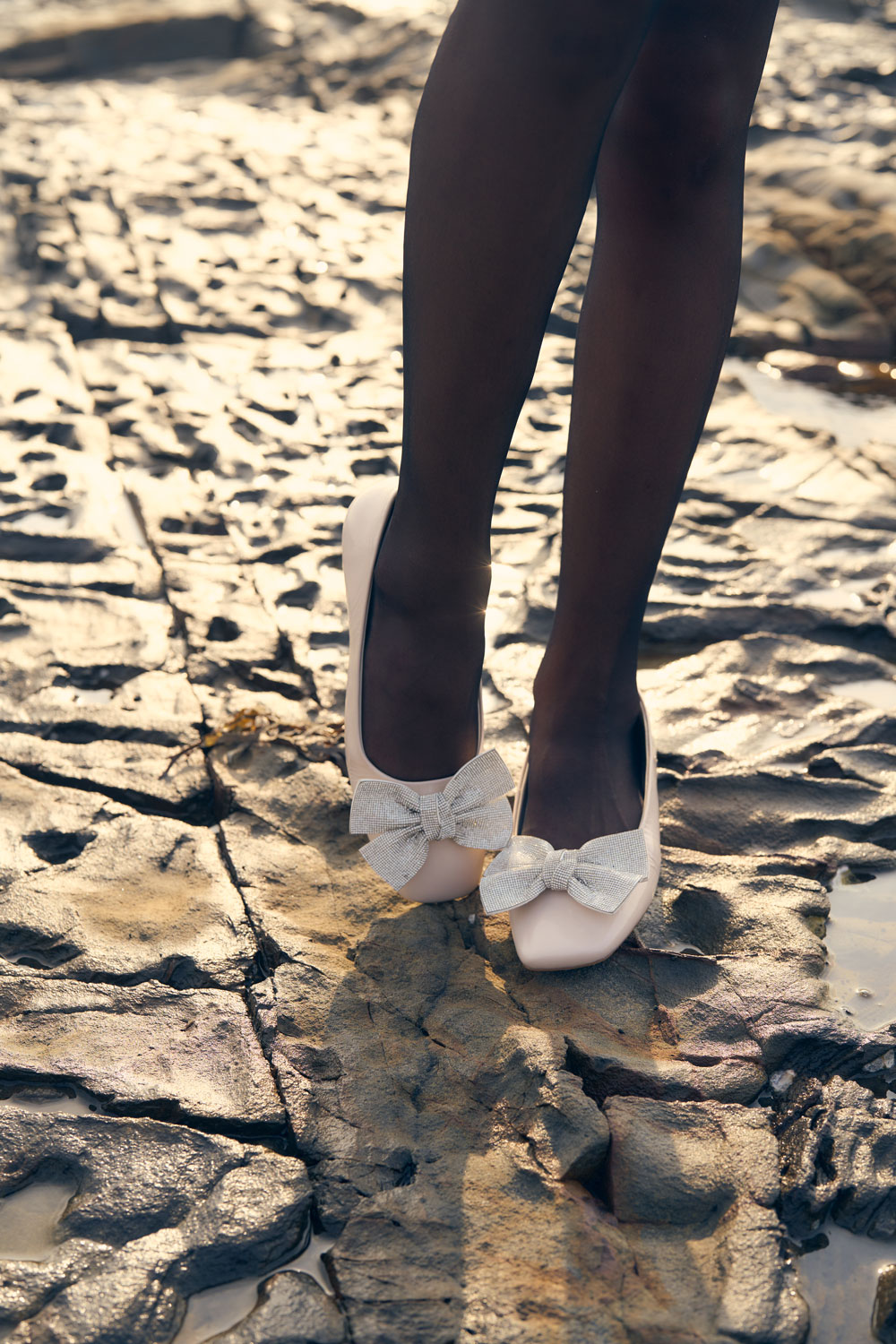 The Barnsley flat offers a chic twist on the classic ballet flat. Crafted from glossy black patent leather, its rounded square toe provides a contemporary silhouette. A dazzling silver bow, textured and eye-catching, adorns the toe box, adding a touch of feminine glamour. The low profile and thin sole ensure all-day comfort, making it perfect for both casual and dressier occasions. This flat is a versatile piece, designed to add a touch of sparkle to any outfit. The light background emphasizes the shoe’s sleek design and glittery bow.