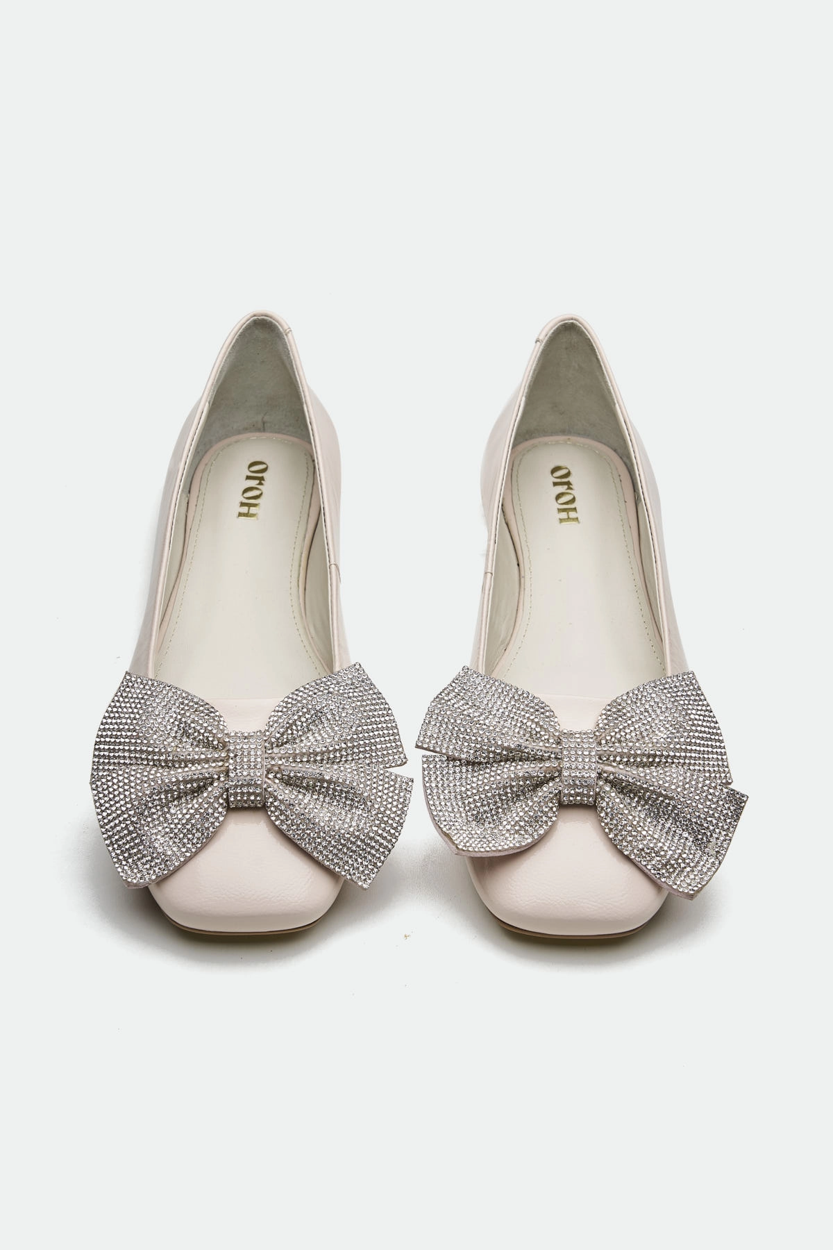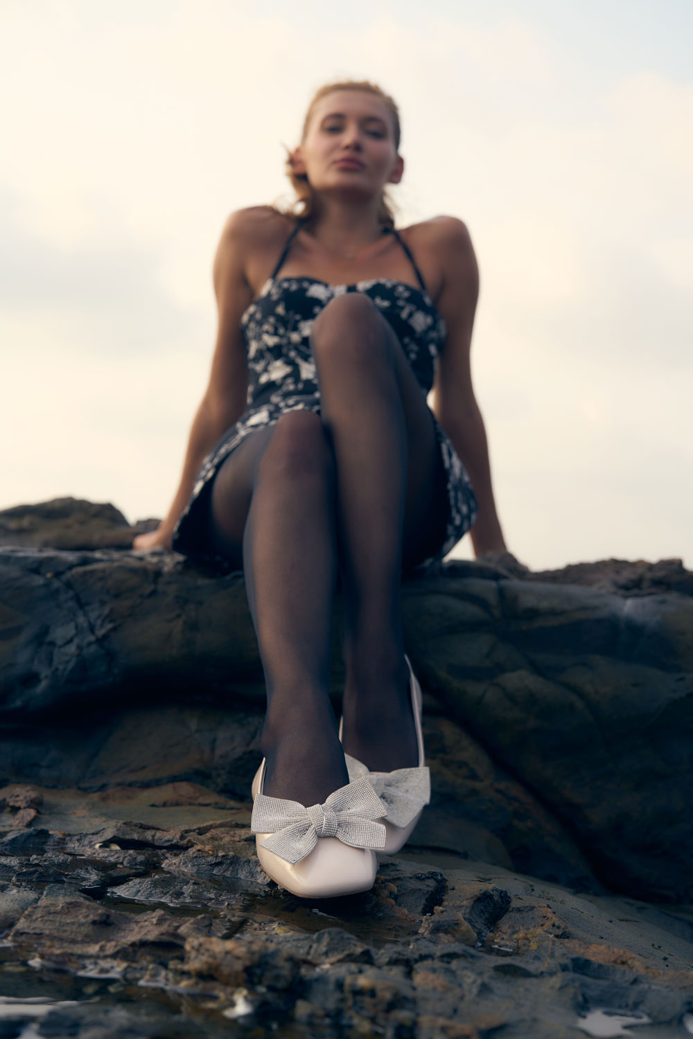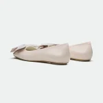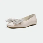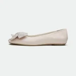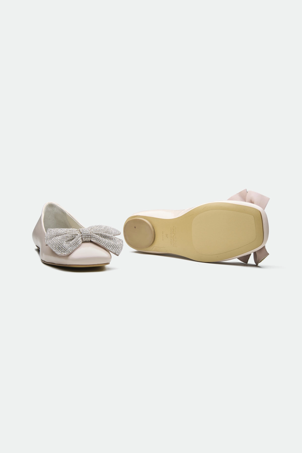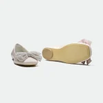 The Barnsley flat offers a chic twist on the classic ballet flat. Crafted from glossy black patent leather, its rounded square toe provides a contemporary silhouette. A dazzling silver bow, textured and eye-catching, adorns the toe box, adding a touch of feminine glamour. The low profile and thin sole ensure all-day comfort, making it perfect for both casual and dressier occasions. This flat is a versatile piece, designed to add a touch of sparkle to any outfit. The light background emphasizes the shoe’s sleek design and glittery bow.