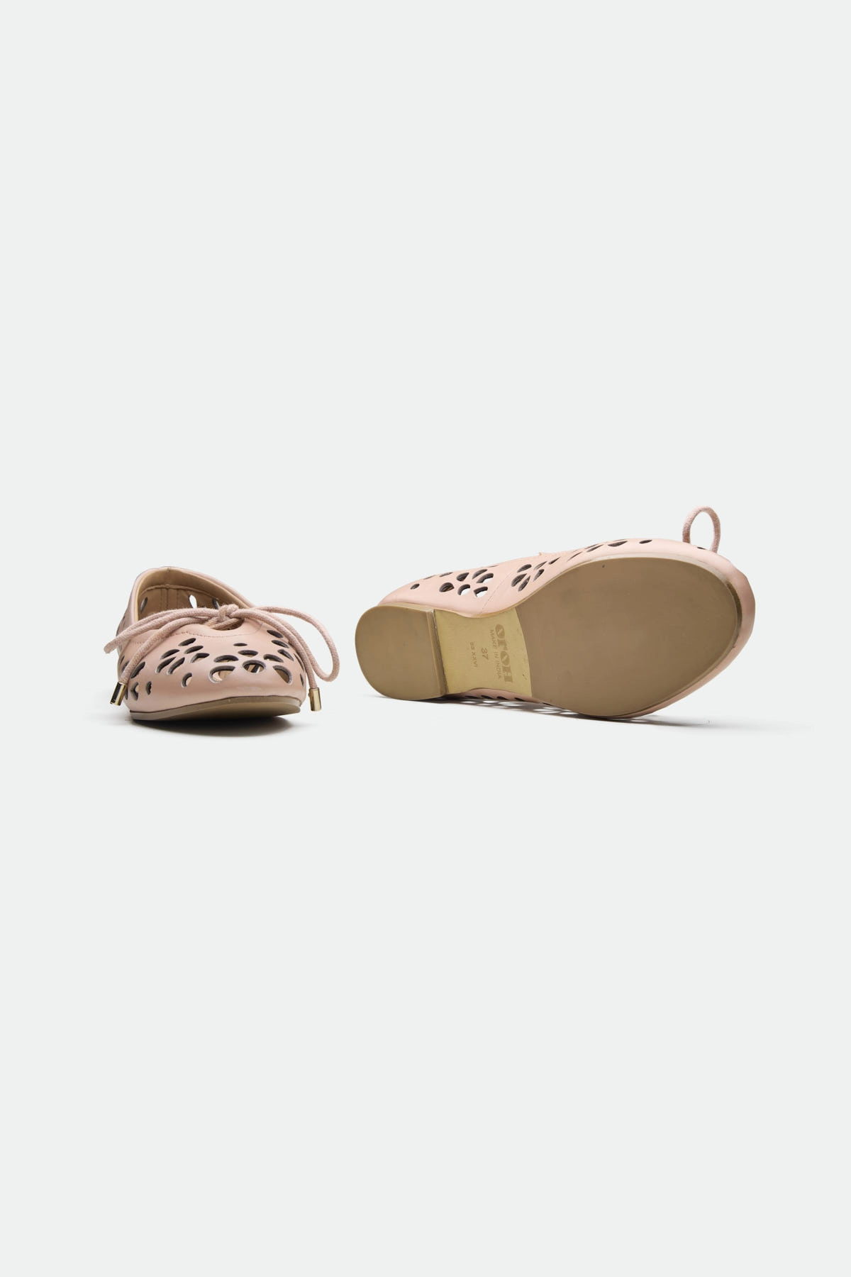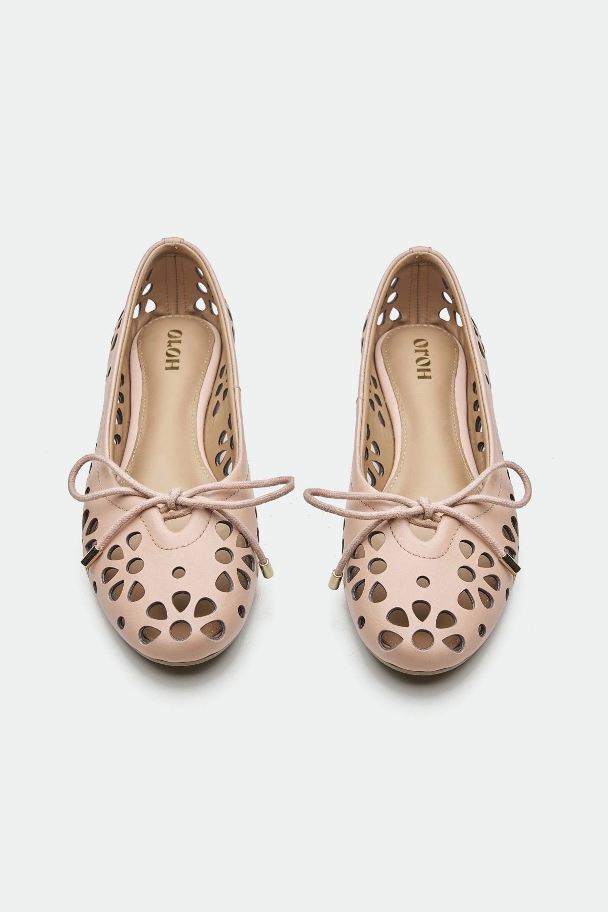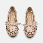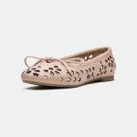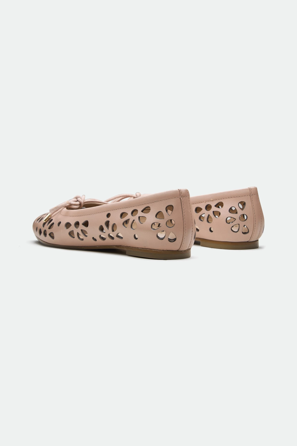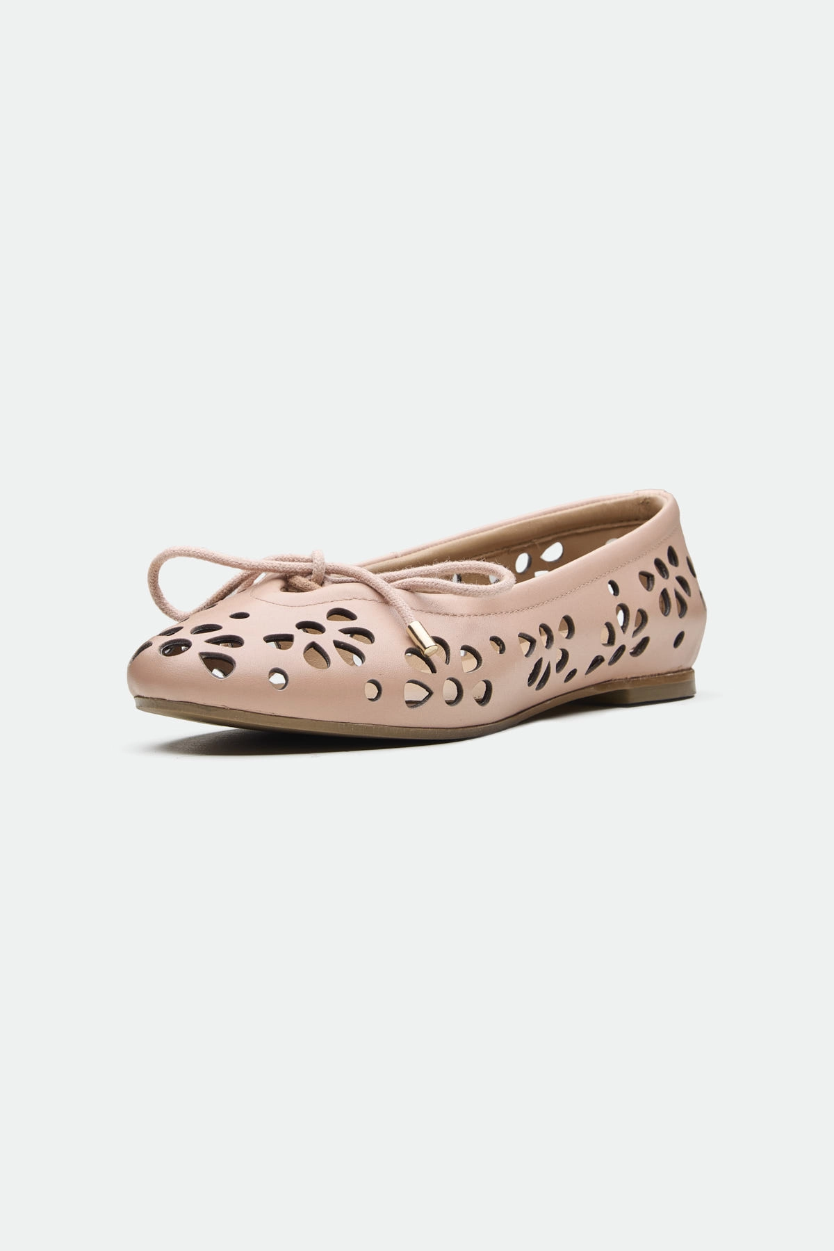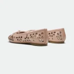 The Bury ballerina presents a delicate yet modern design. Crafted from a summerish leather, it features intricate laser-cut flower patterns, creating a unique, airy texture. The lace-up detailing at the vamp adds a touch of bohemian charm, while the sharp-edged metal ends on the laces provide a contemporary, almost industrial contrast. This ballerina offers a blend of feminine detail and modern accents. The light background emphasizes the intricate cutouts and warm color of the shoe.