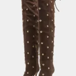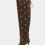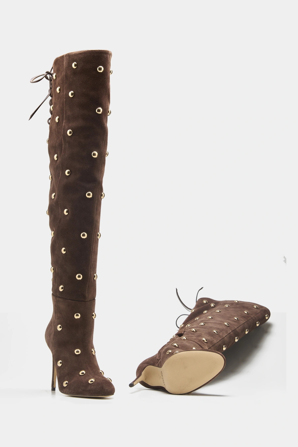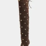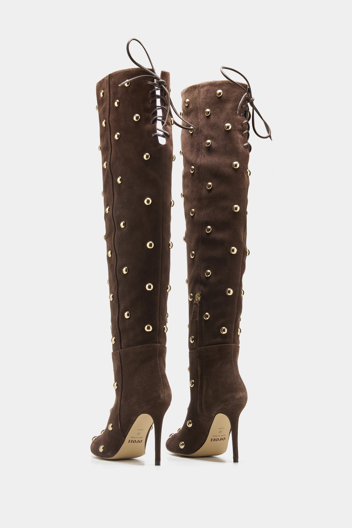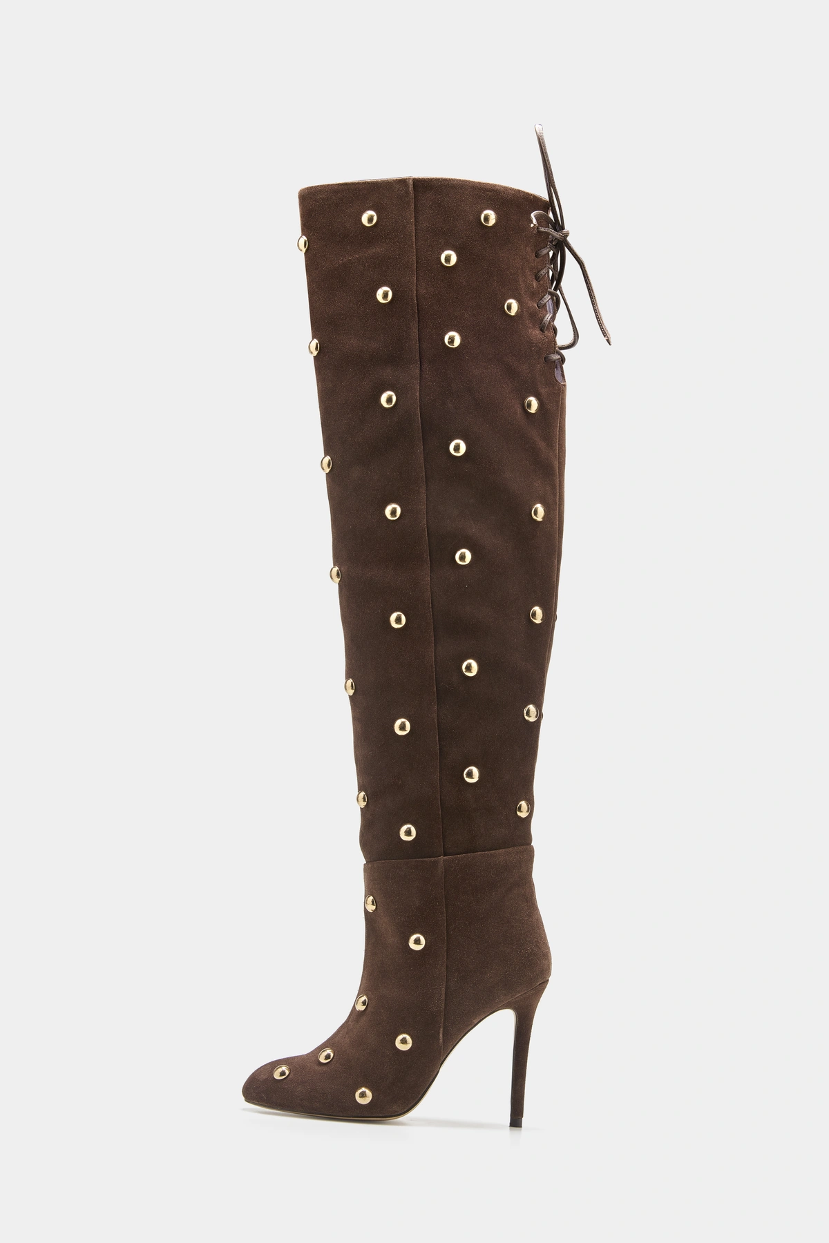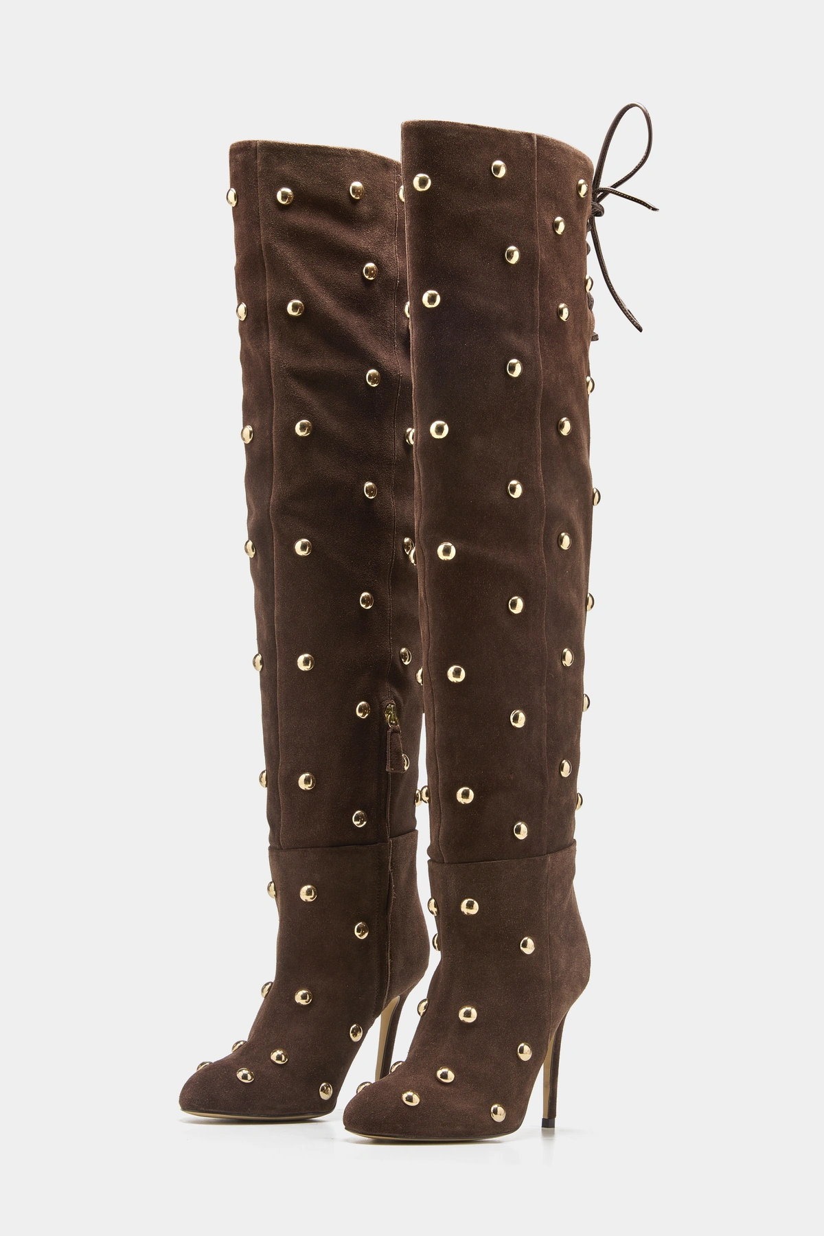 Dolores Knee High Boots come in two colors: powerful black and graceful castagna. These boots have a sleek, tall shape and a chic pencil heel that make them a great choice for teaming with dresses, skirts, or skinny jeans for a striking day-to-night look.