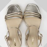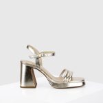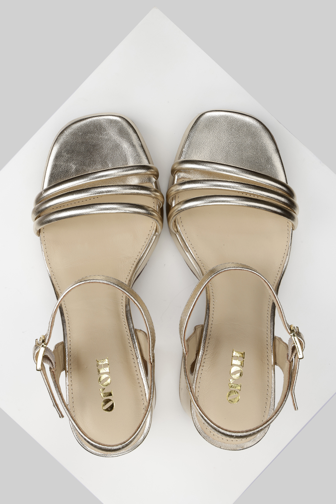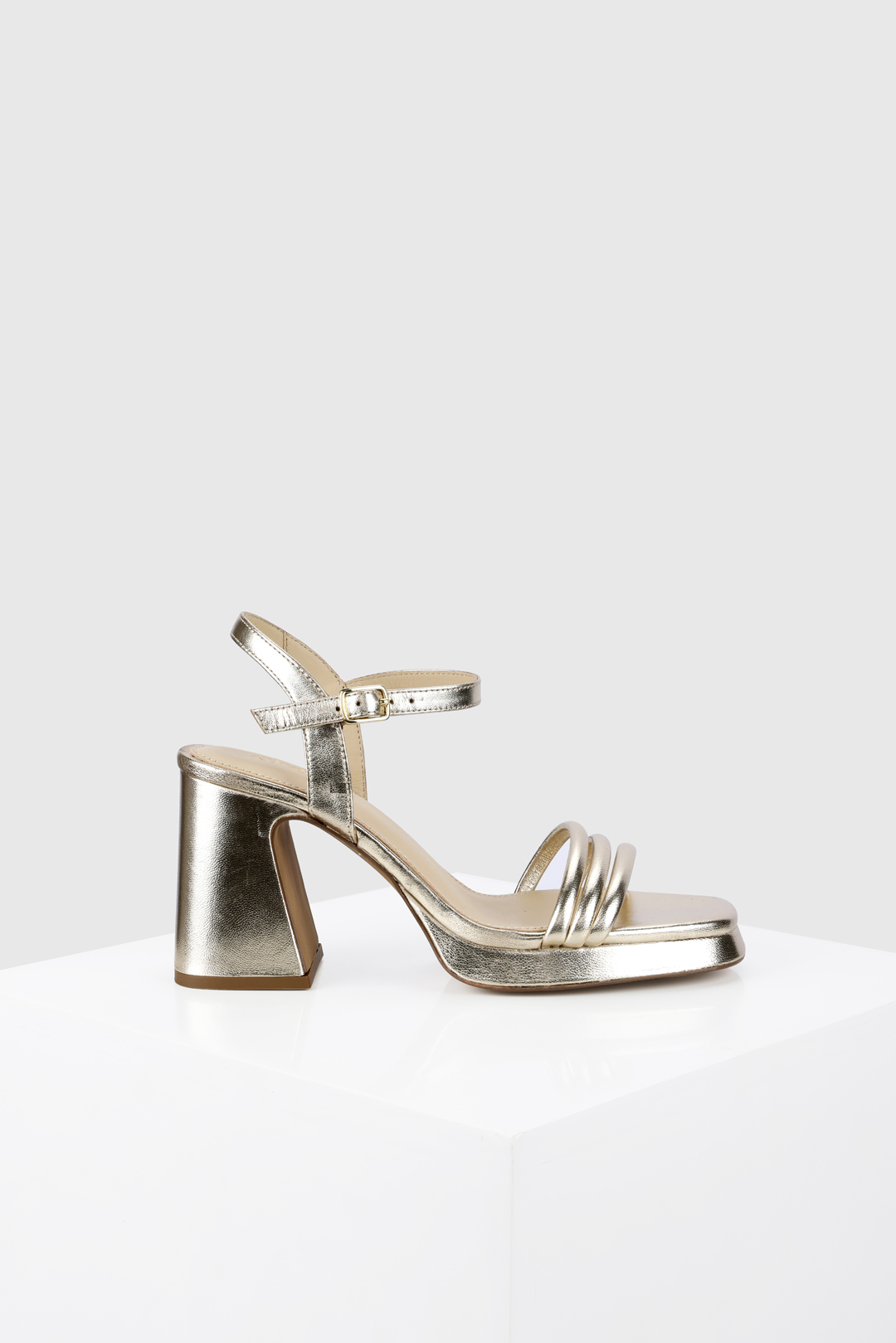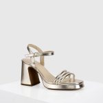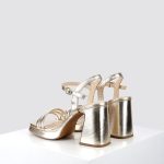 The Morganite is a high block heeled platform sandal. The platform, and heel are covered with our gold foil leather which is also used for the straps. Th gentle platform along with the unique straps gives this style a distinct silhouette. All our sandals are designed in Europe and manufactured using premium materials in India.