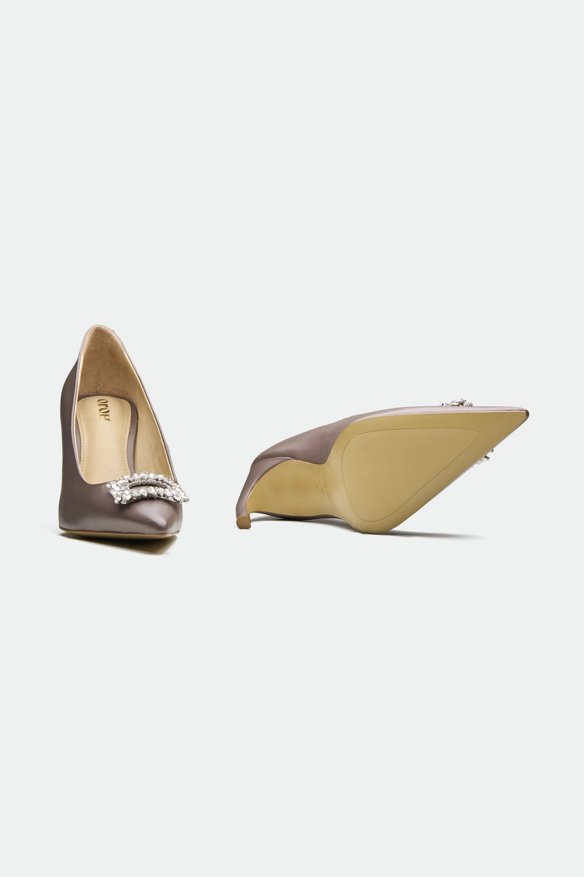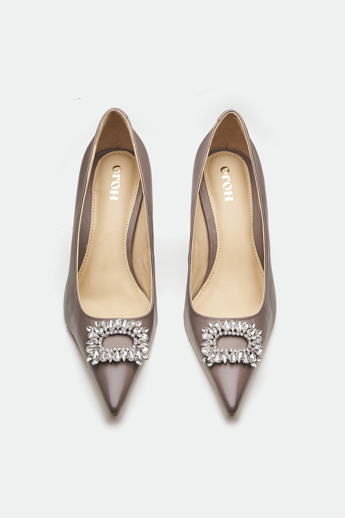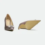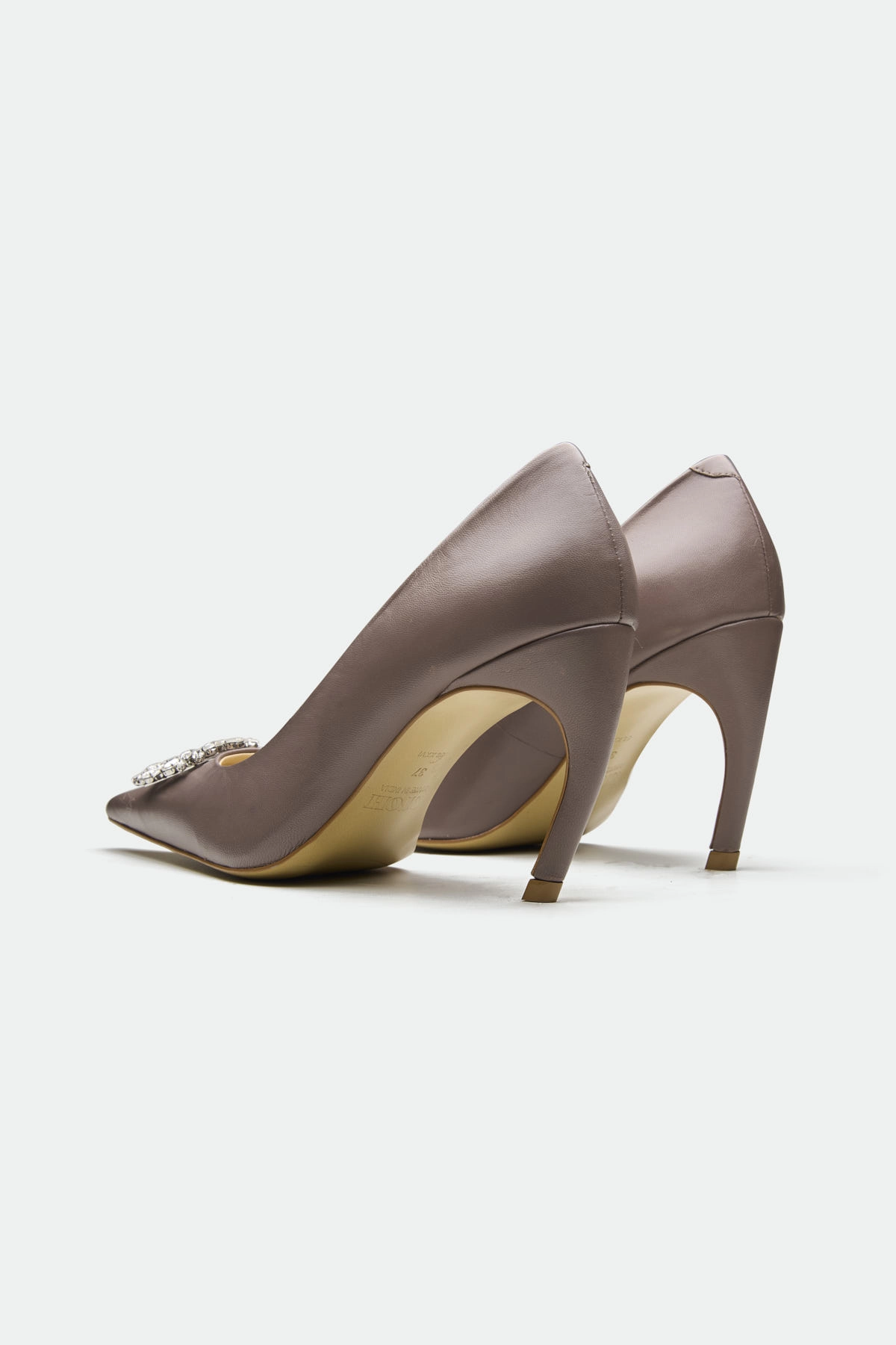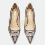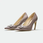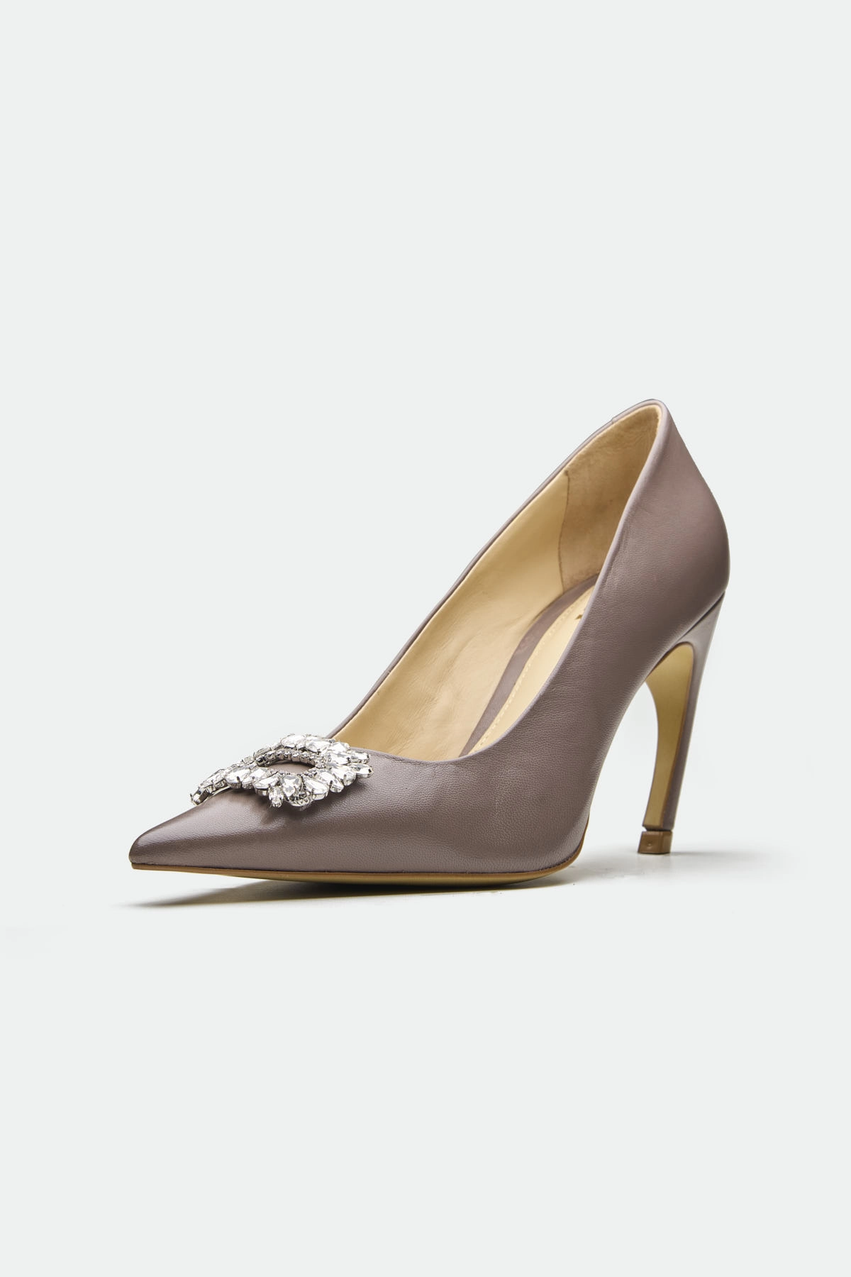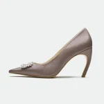 The Cambridge pump offers a sophisticated silhouette in a warm, neutral leather. Its classic pointed-toe pump design is elevated by a captivating stone trim, a cluster of faceted gems that catch the light with every step. This eye-catching embellishment adds a touch of glamour, making the “Lumina” perfect for both special occasions and adding a touch of sparkle to everyday elegance. The sleek heel provides a comfortable lift, ensuring both style and grace.