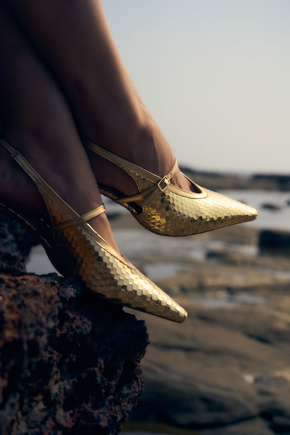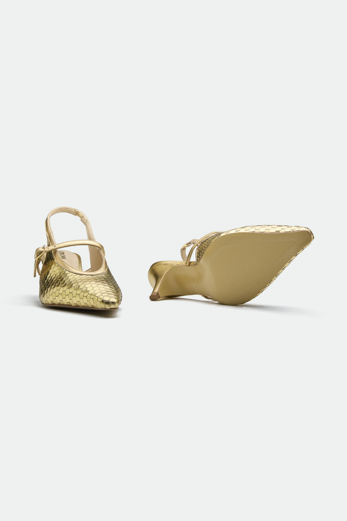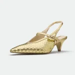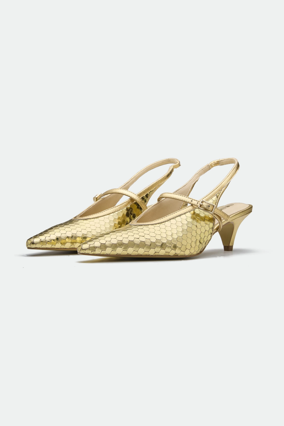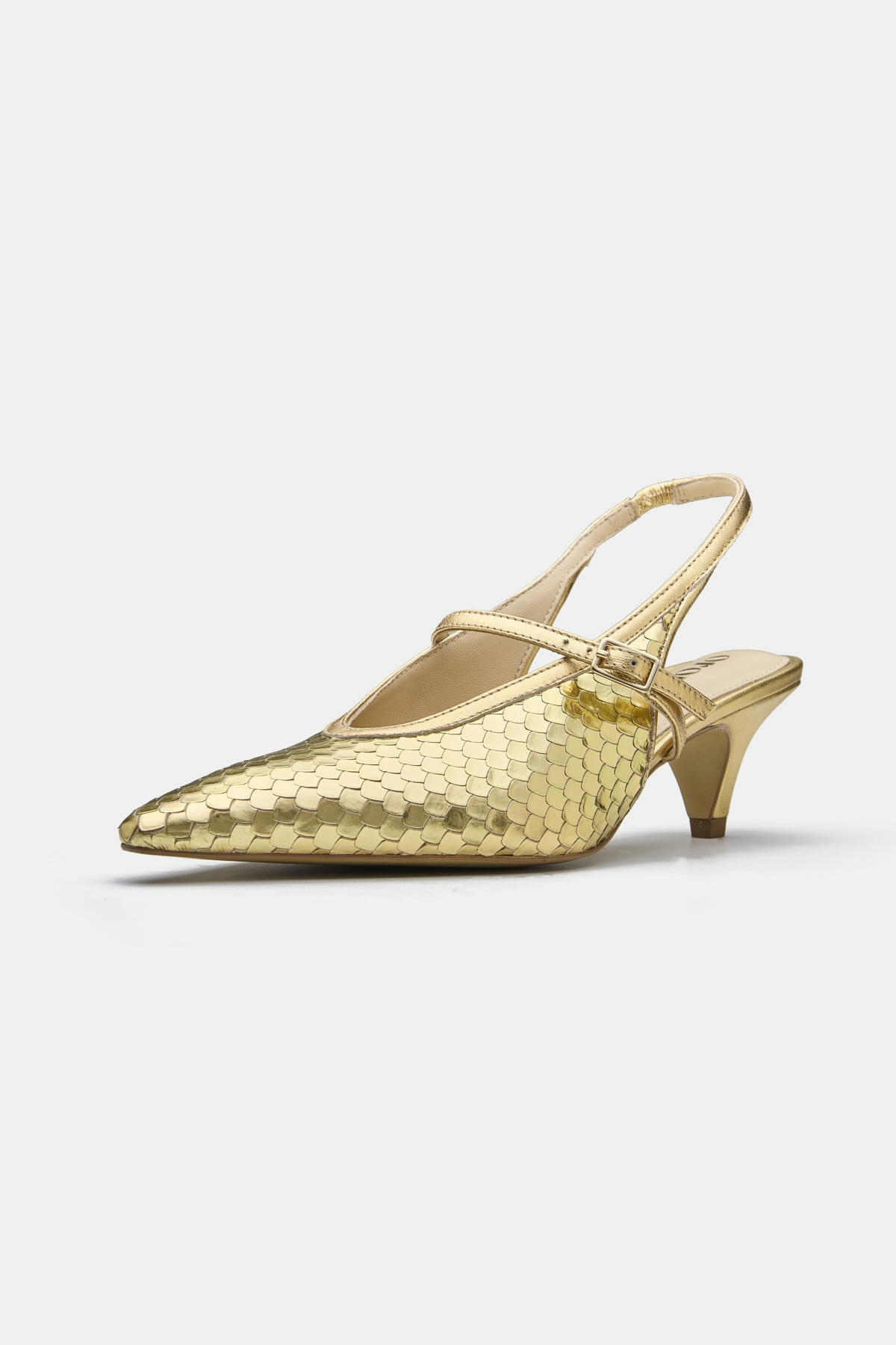 The Blackpool slingback captures attention with its radiant leather with unique pattern.Its 10mm thin, dual straps cross delicately over the foot, adding a touch of modern geometry. The mid-heel provides a comfortable lift, making it perfect for both daytime elegance and evening glamour. A slender ankle strap with a buckle closure ensures a secure fit. The pointed toe elongates the leg, creating a sleek silhouette.