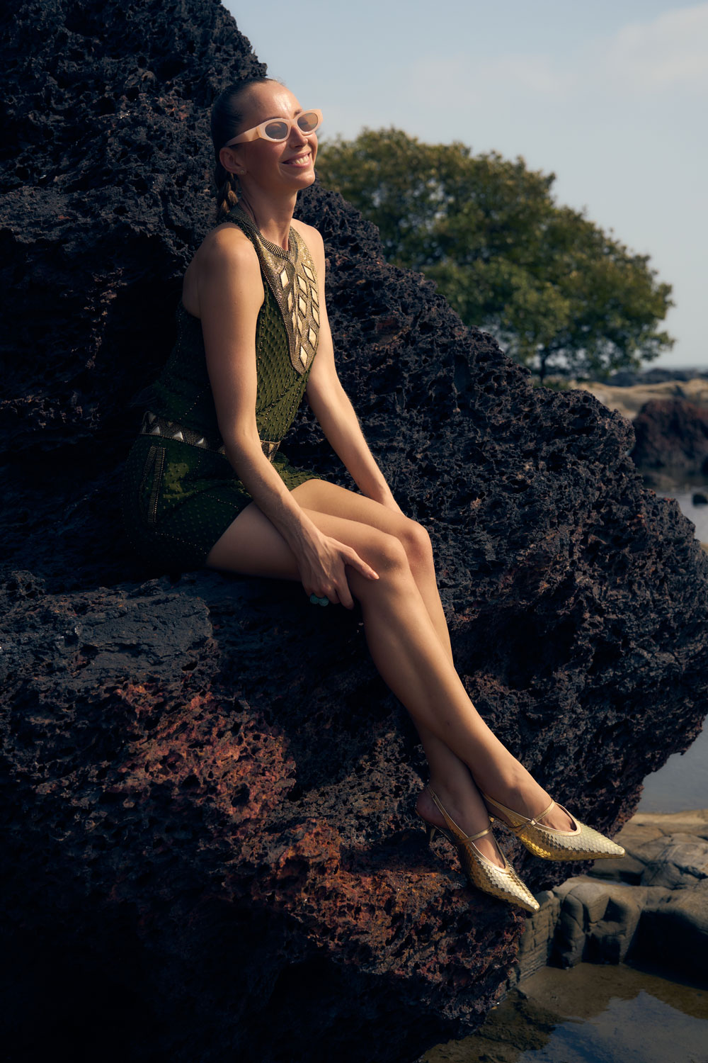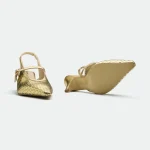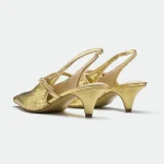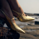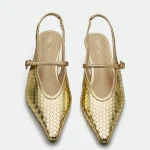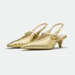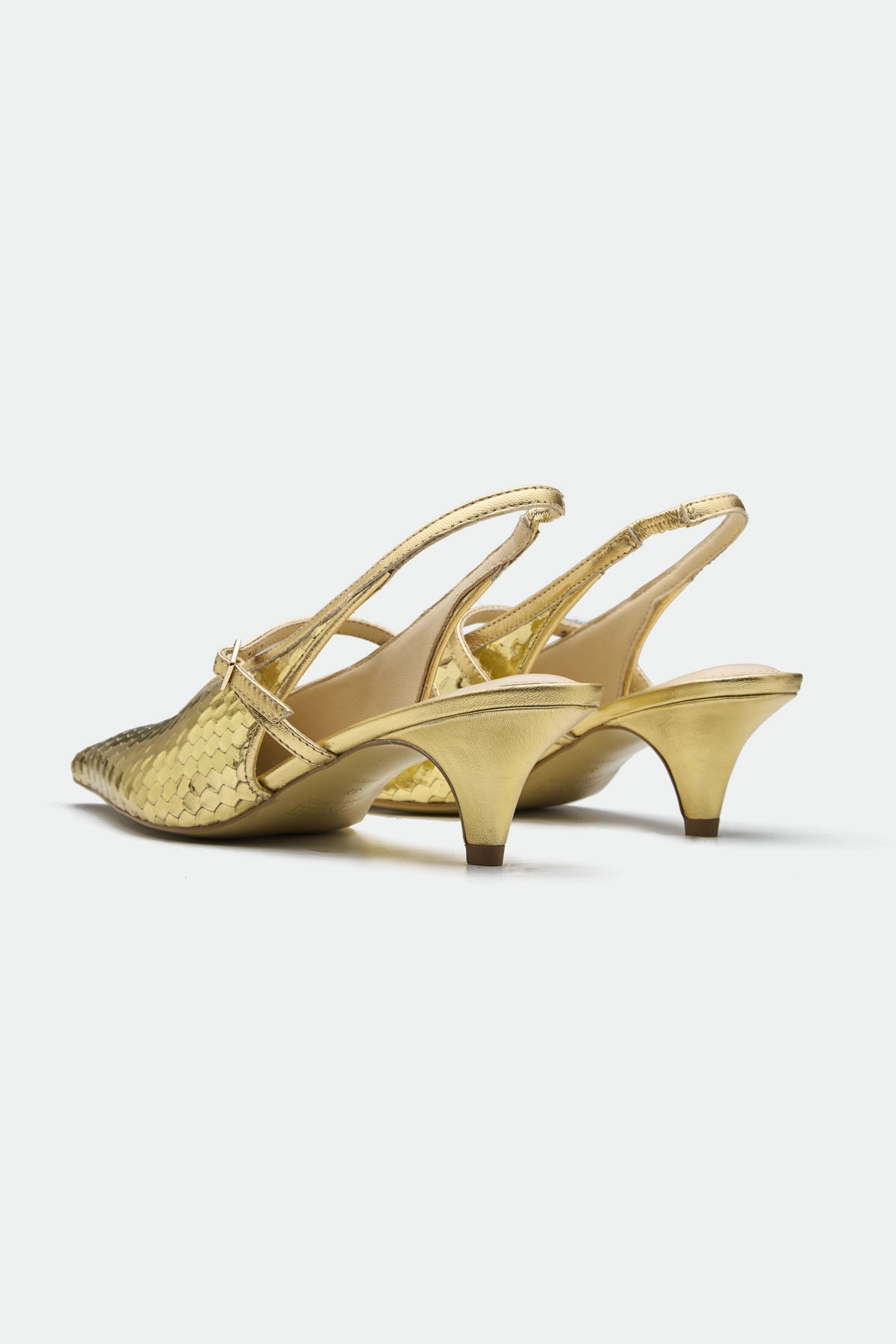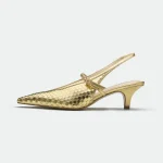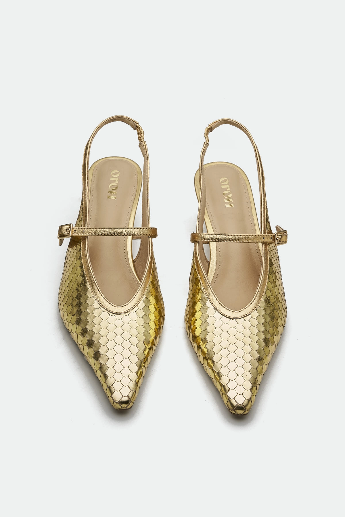The Blackpool slingback captures attention with its radiant leather with unique pattern.Its 10mm thin, dual straps cross delicately over the foot, adding a touch of modern geometry. The mid-heel provides a comfortable lift, making it perfect for both daytime elegance and evening glamour. A slender ankle strap with a buckle closure ensures a secure fit. The pointed toe elongates the leg, creating a sleek silhouette.