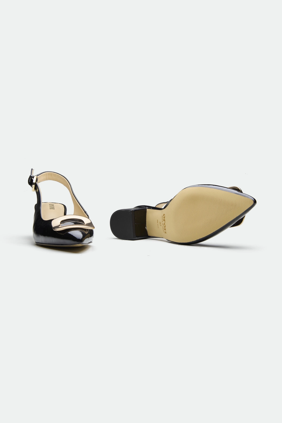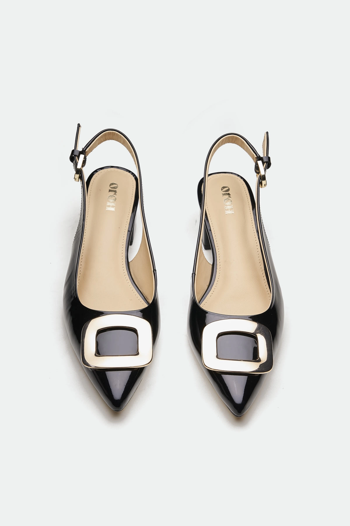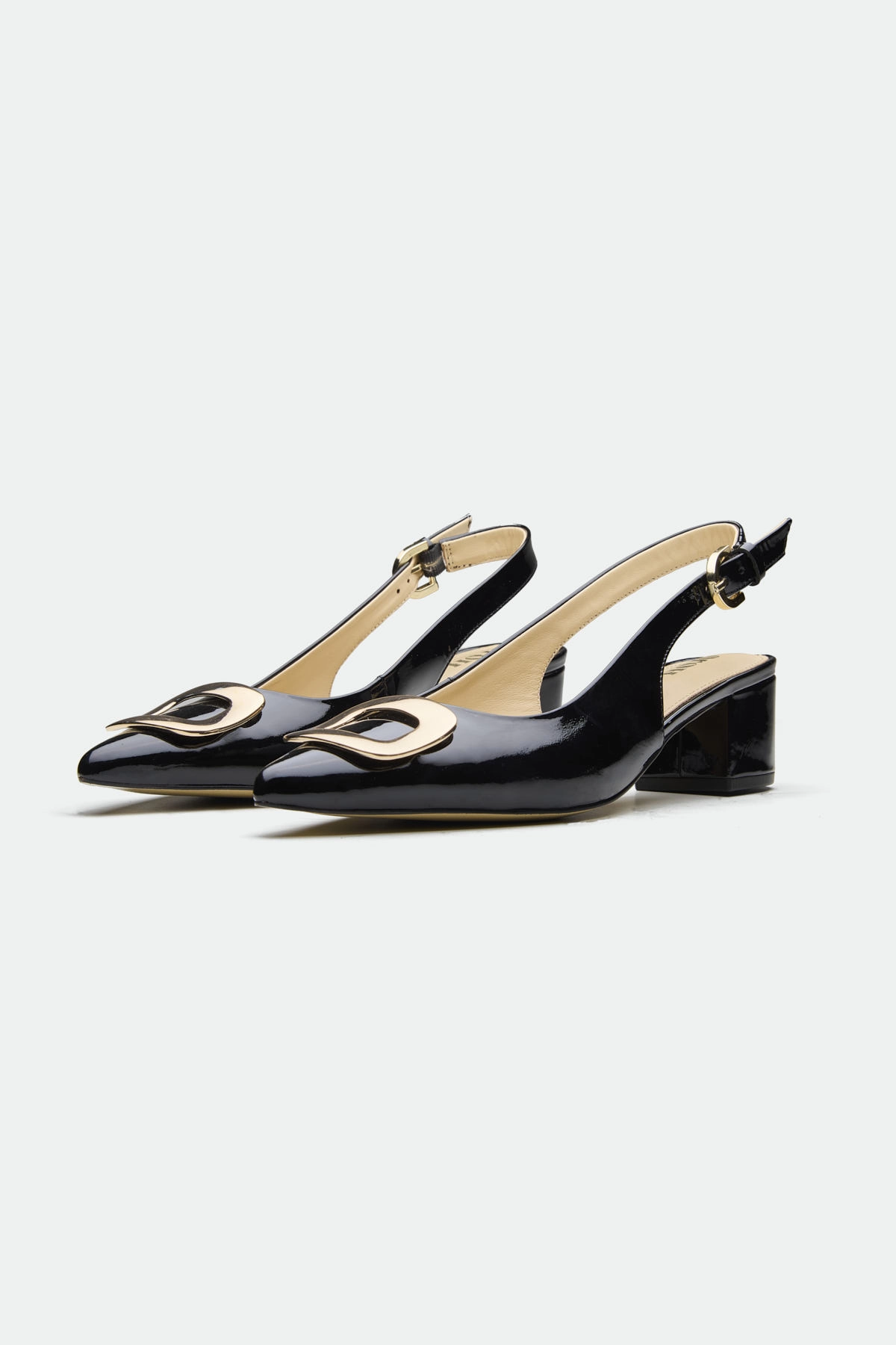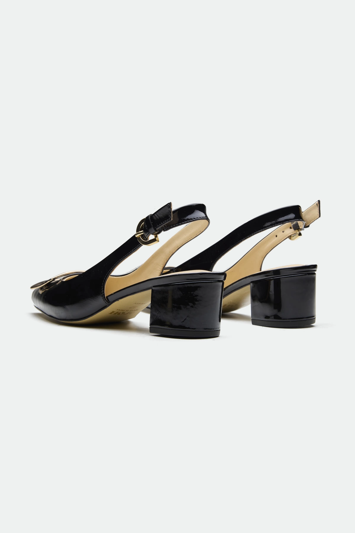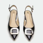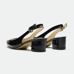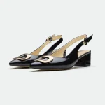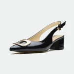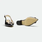 The Derry slingback offers a modern twist on classic elegance.Crafted from rich leather, it features a striking metal square trim at the toe, adding a touch of bold hardware and geometric detail. The slingback design, with its adjustable ankle strap and buckle closure, provides a secure and comfortable fit. The blocky heel offers a stable and stylish lift, making it perfect for both day-long wear and evening events.