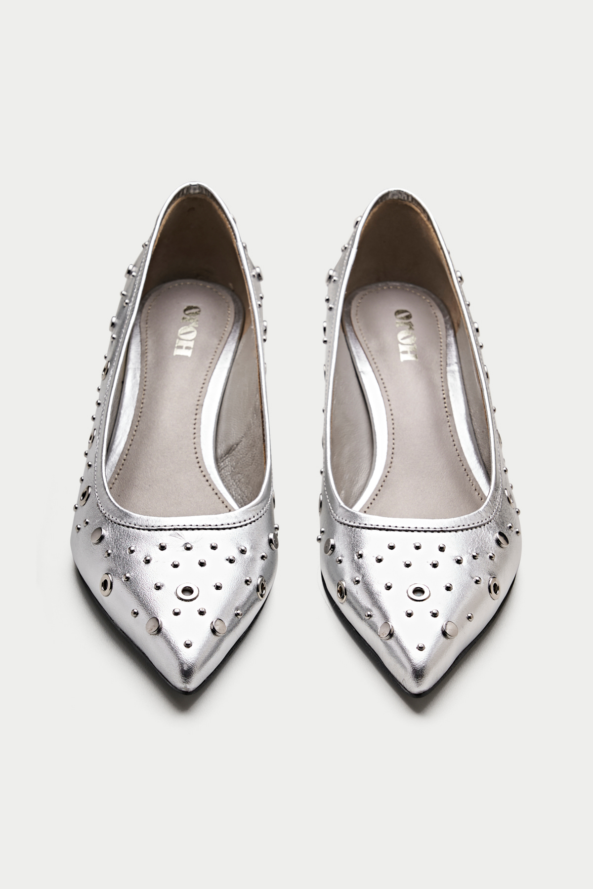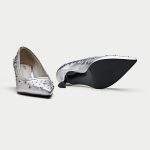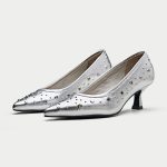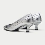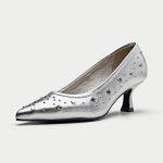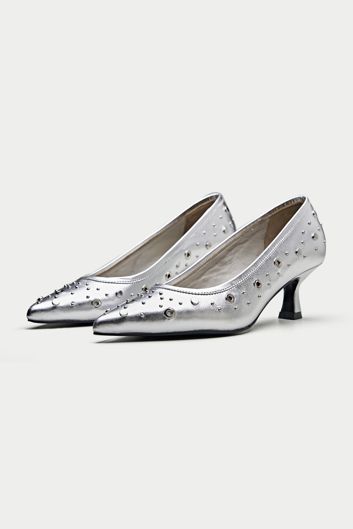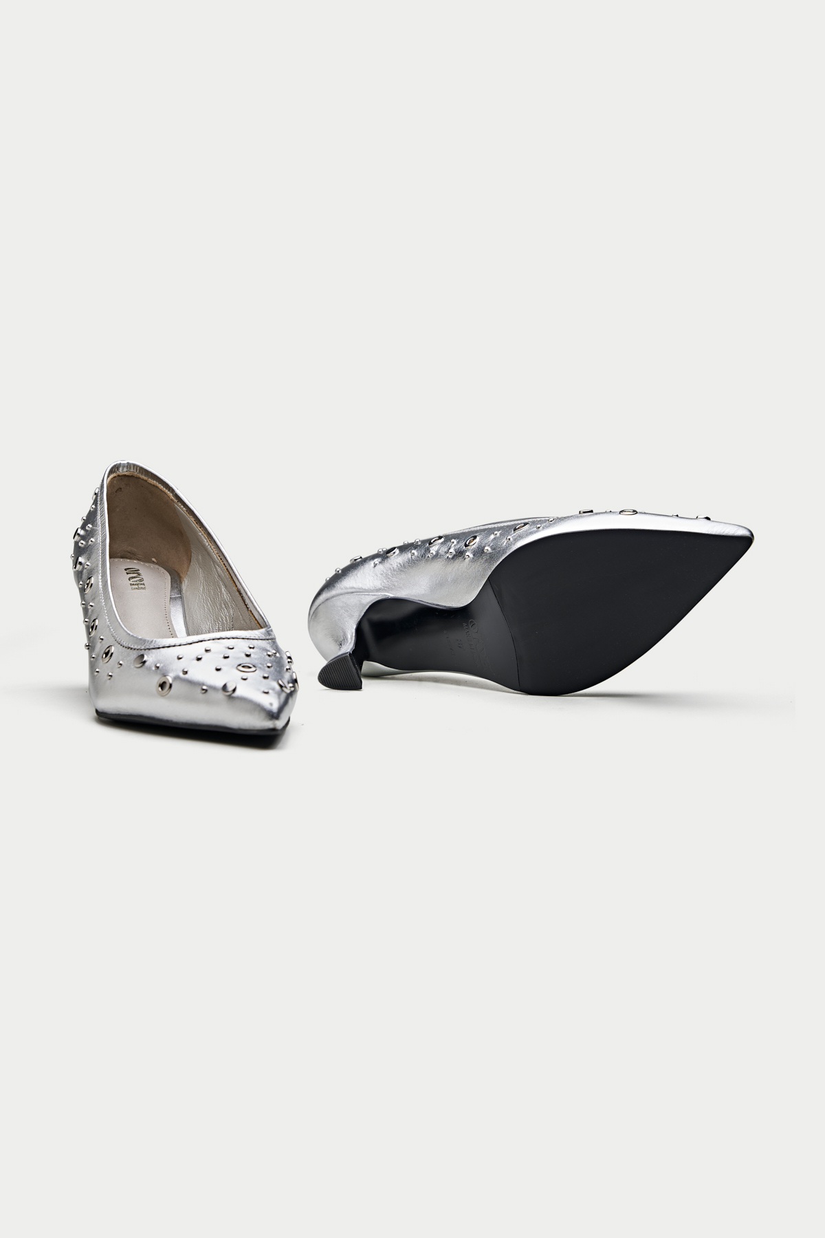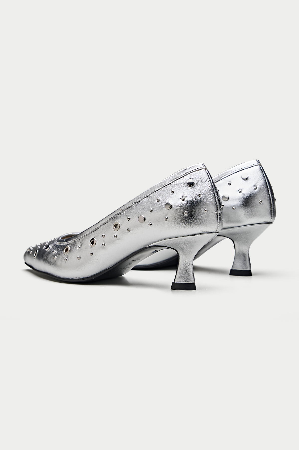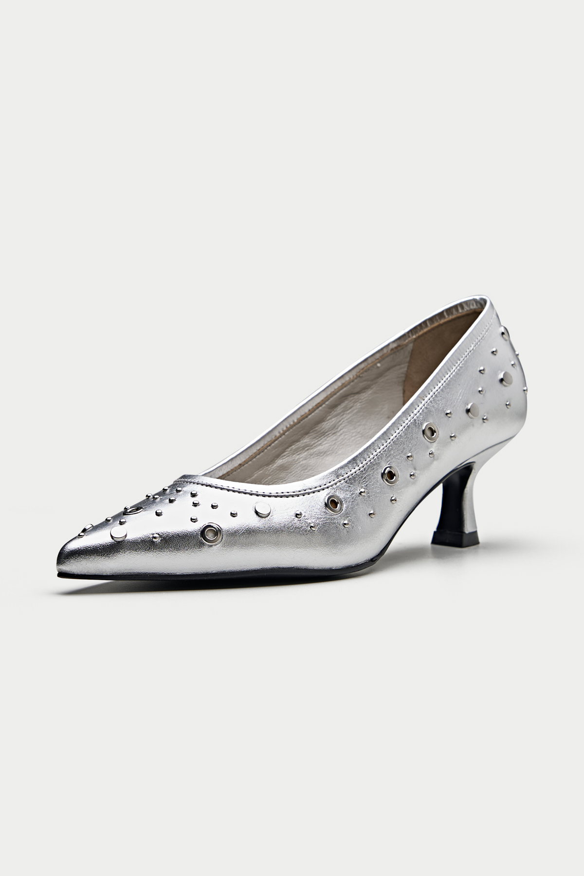 Make a bold statement with these edgy black pumps. The sleek leather upper is adorned with an array of silver eyelets, giving them a rebellious and rock-chic vibe. The pointed toe and kitten heel add a touch of sophistication, while the comfortable lining ensures all-day wearability. The Piombino is perfect for elevating your casual look or adding a touch of personality to your office attire.