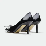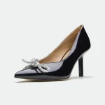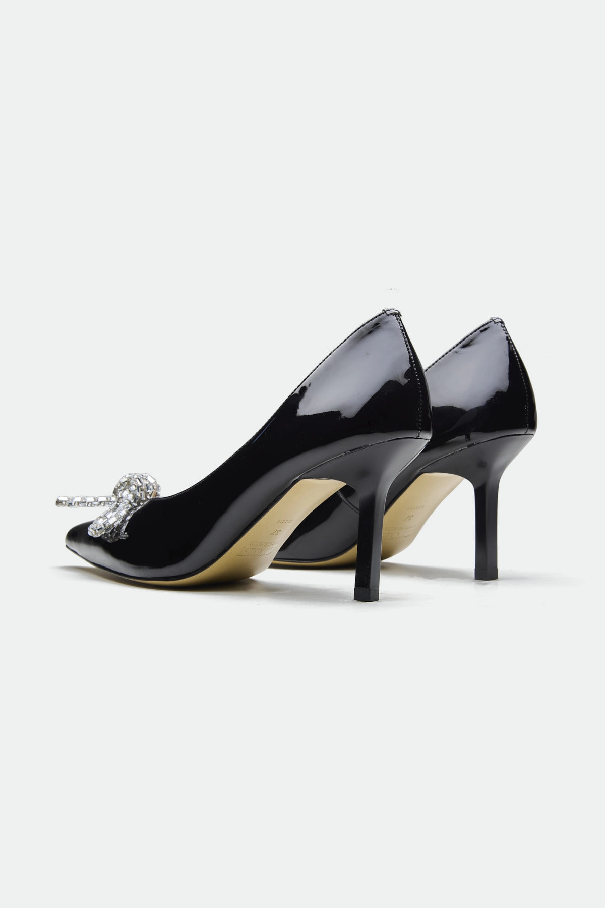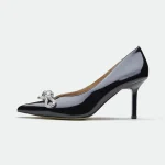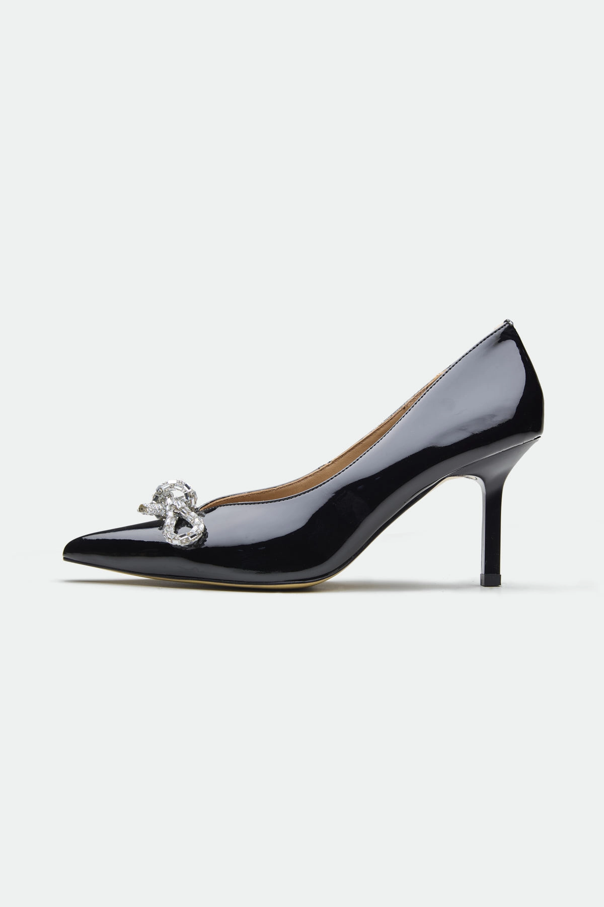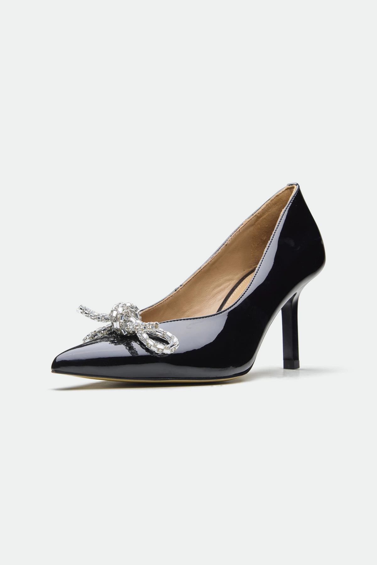 The Warrington pump commands attention with its glossy patent leather. A dazzling crystal bow, like a jeweled corsage, adorns the pointed toe, adding a touch of playful glamour. The sharp neck and stiletto heel create a sleek, feminine silhouette. This shoe is a statement piece, designed to turn heads with its vibrant color and sparkling detail.