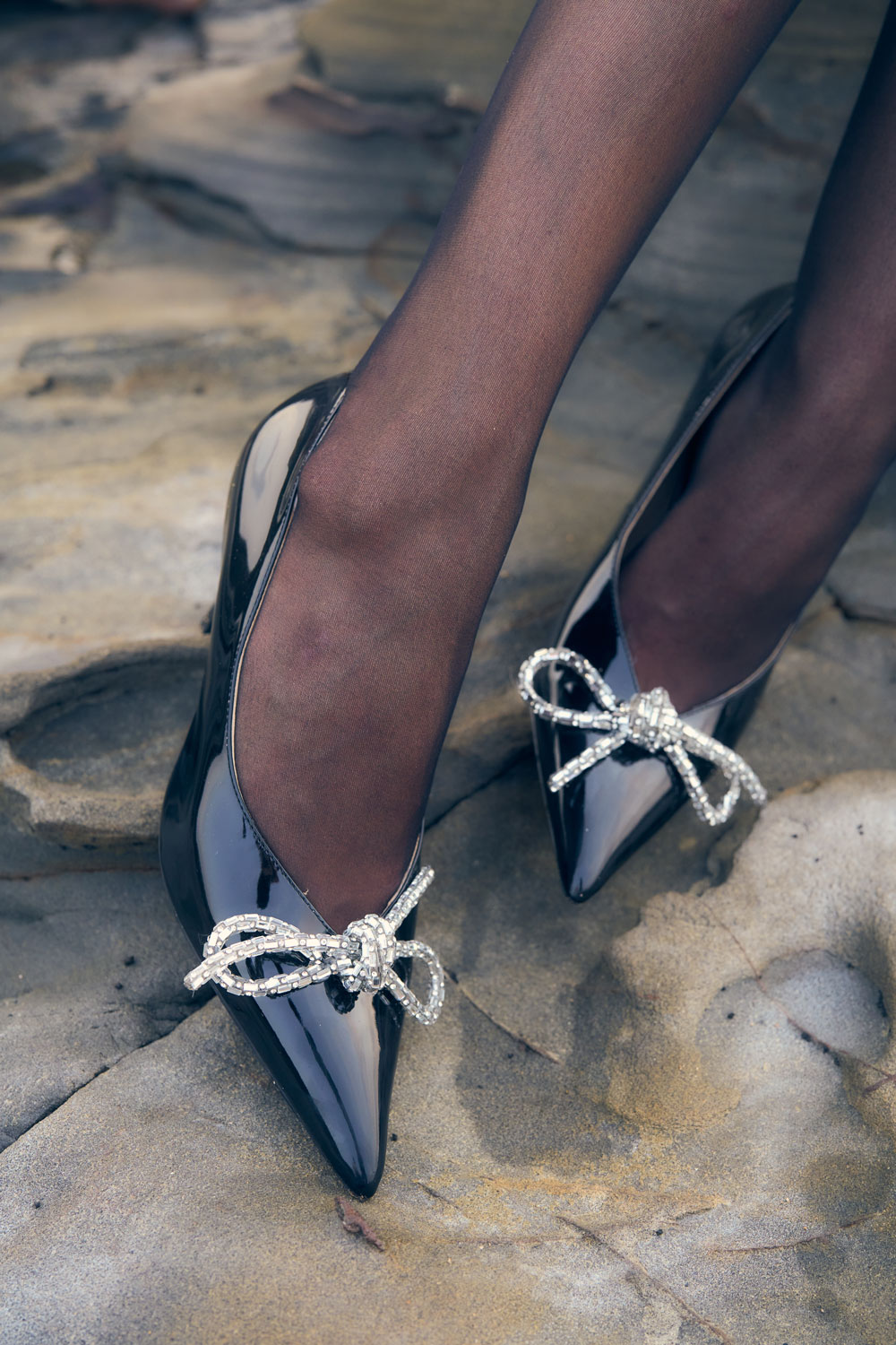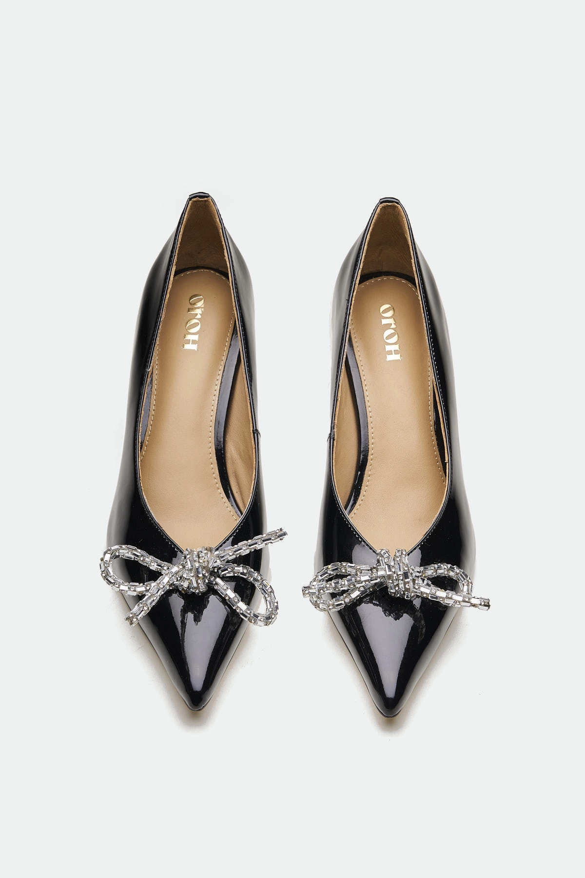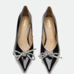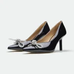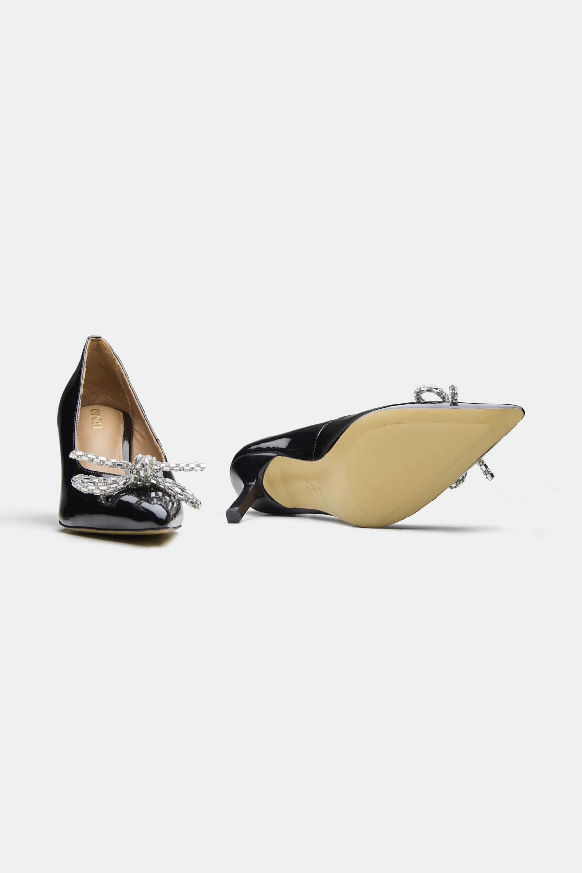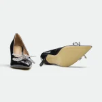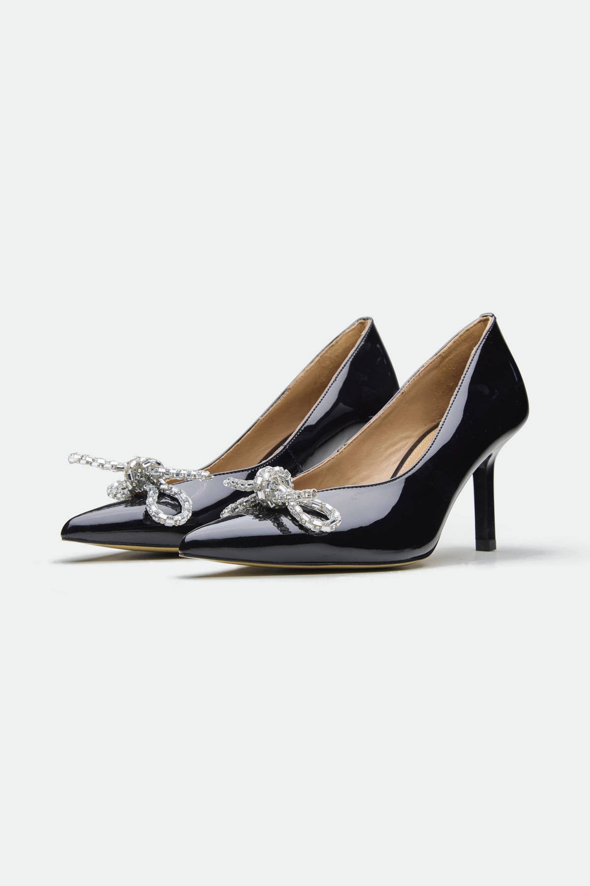 The Warrington pump commands attention with its glossy patent leather. A dazzling crystal bow, like a jeweled corsage, adorns the pointed toe, adding a touch of playful glamour. The sharp neck and stiletto heel create a sleek, feminine silhouette. This shoe is a statement piece, designed to turn heads with its vibrant color and sparkling detail.