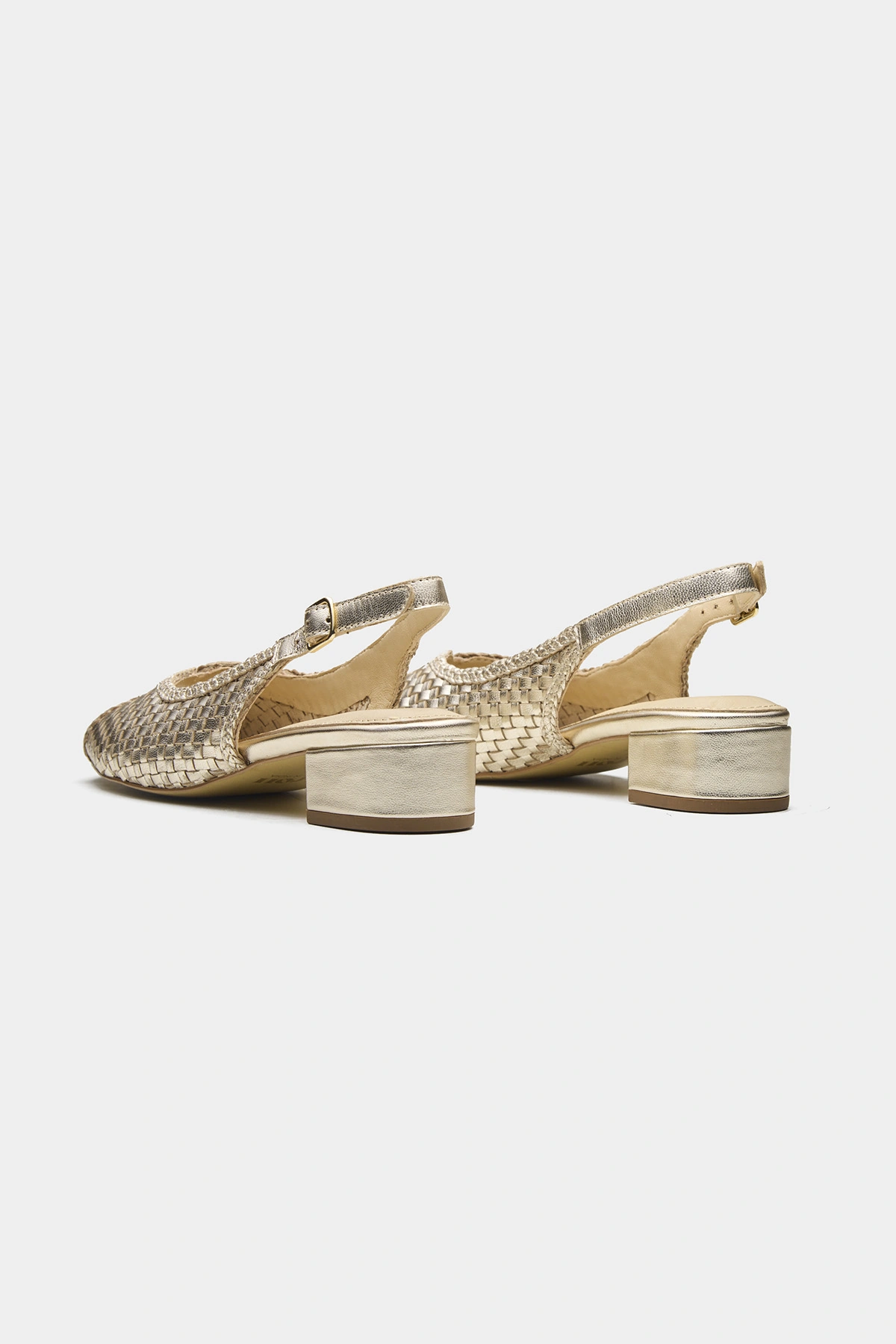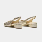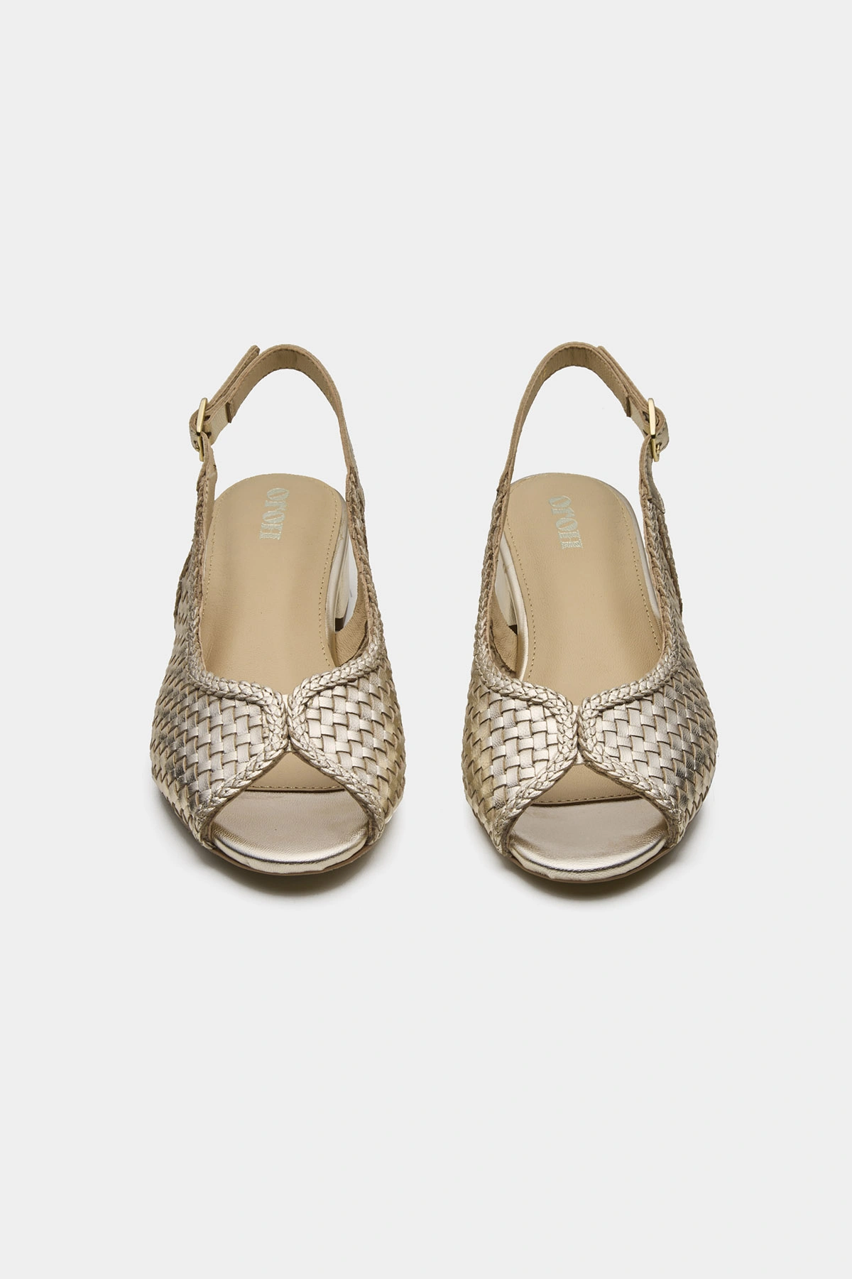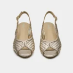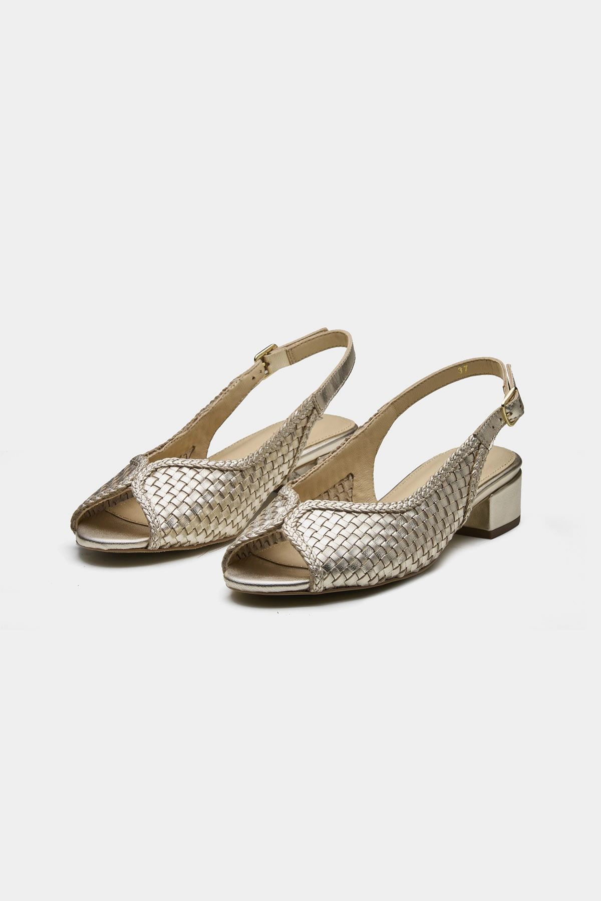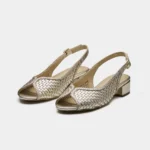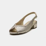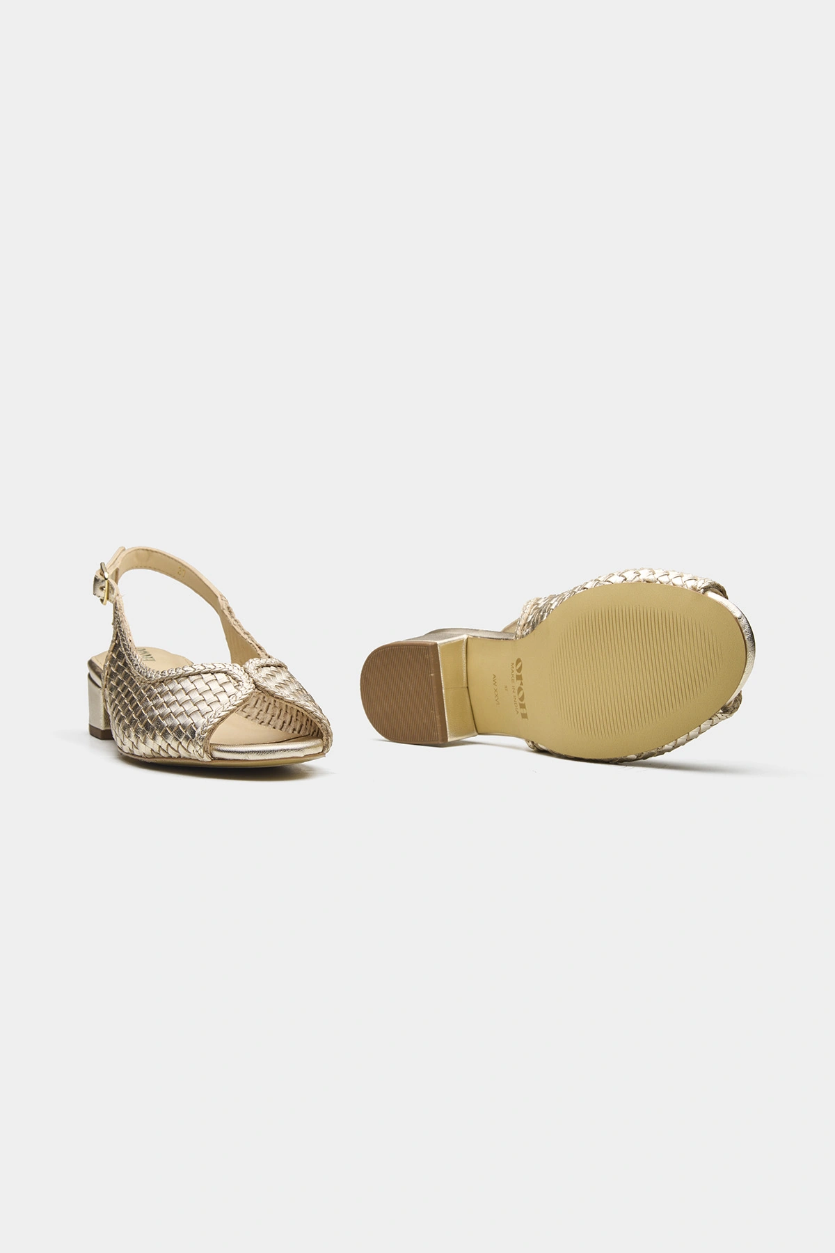 Shine On! Liliana Sandals in Gold and Silvery Shine With a stylish woven upper and supportive block heel, these sandals are both comfortable and chic-weddings, parties, or evening outings are a breeze in these sandals because they perfectly blend style and ease.