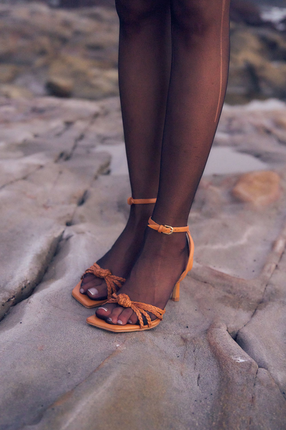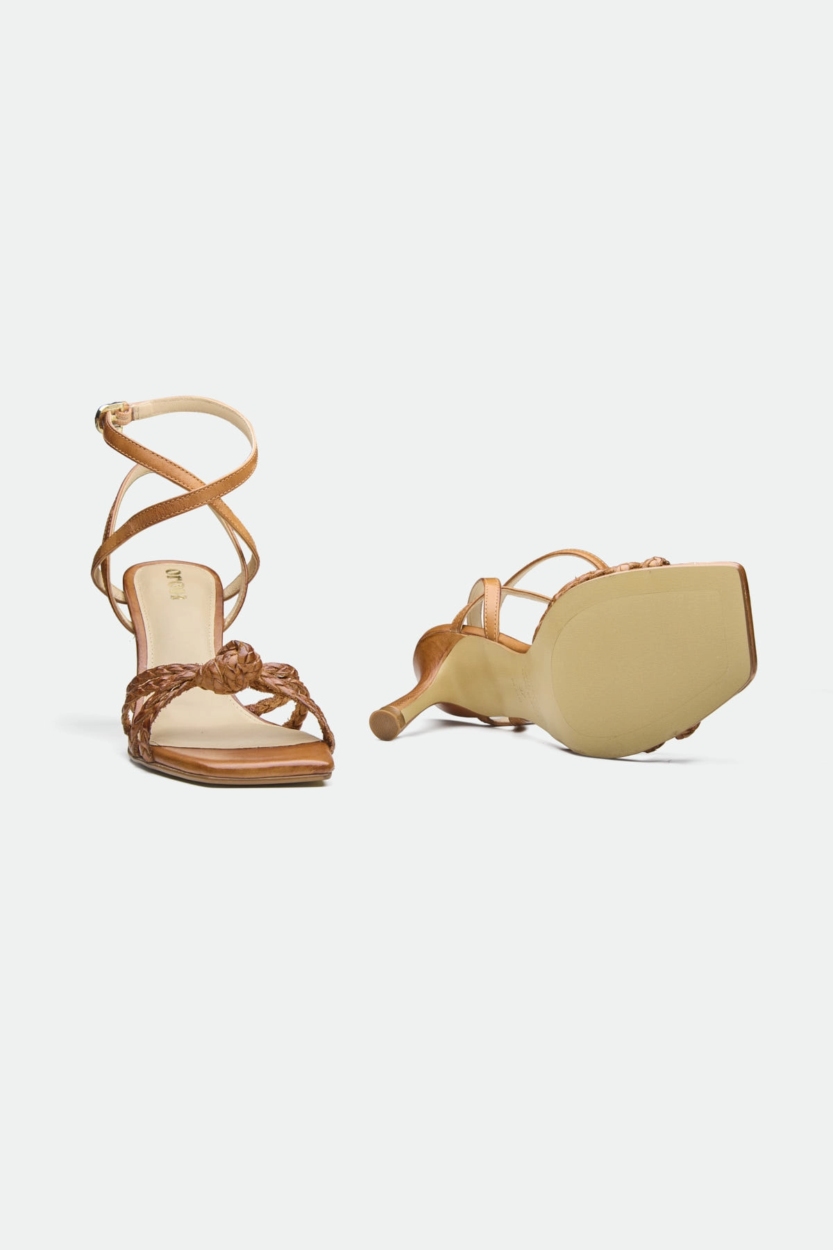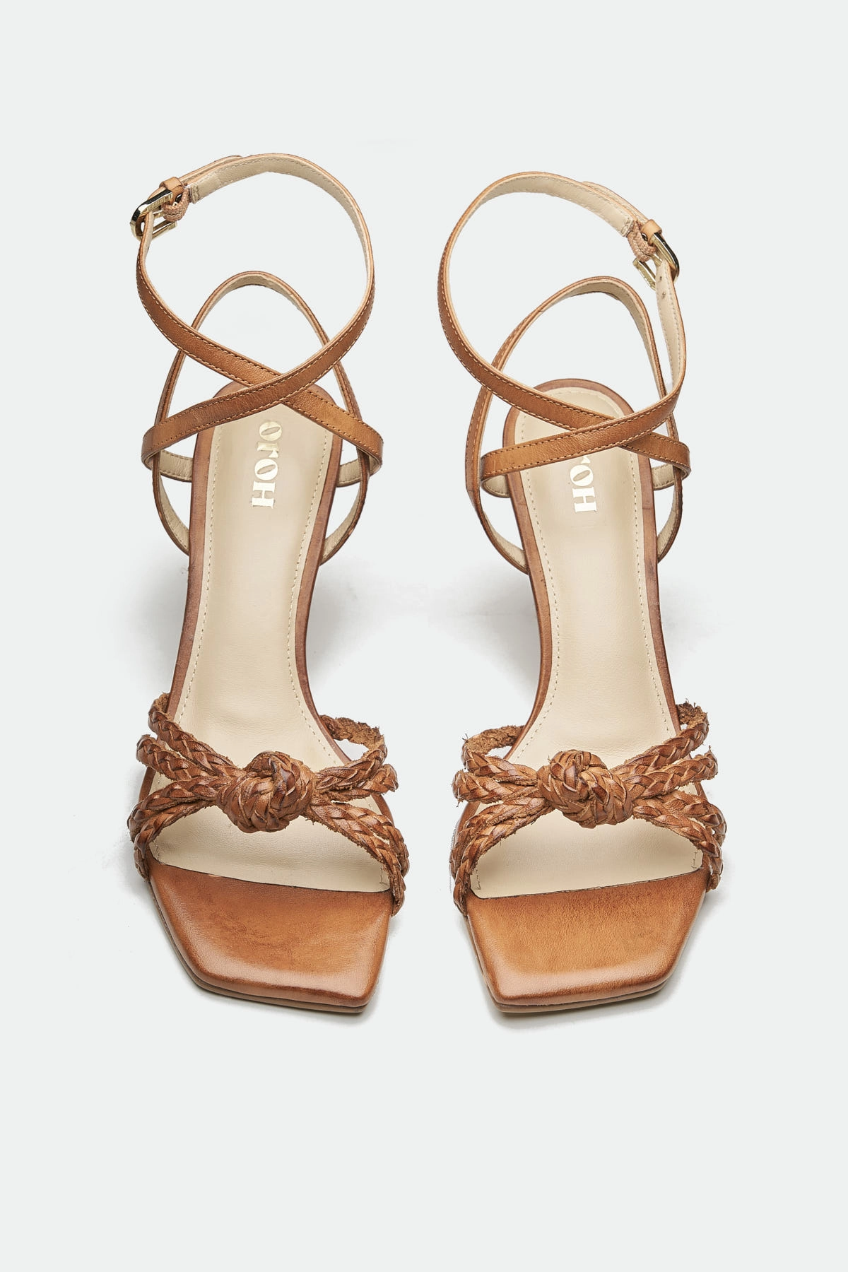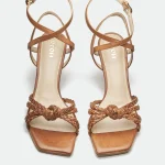 The Nuneaton sandal features intricately braided straps that create a unique, textured look. The straps are gathered into a stylish knot detail at the front, adding a touch of bohemian charm. The mid-height heels provide a comfortable and elegant lift, while the square toe offers a modern silhouette. Crafted from rich, dark brown leather, this sandal is designed for both style and comfort.