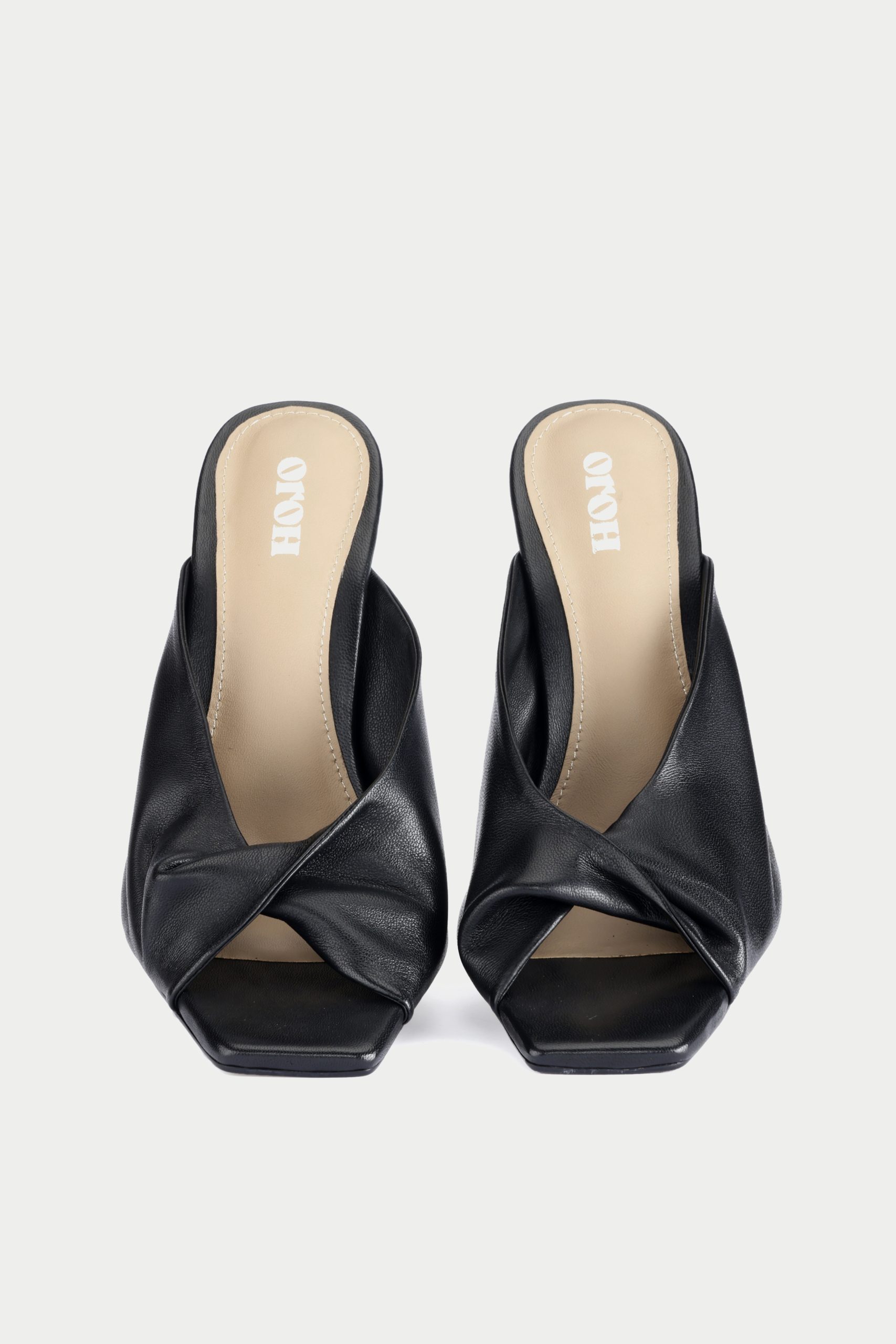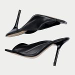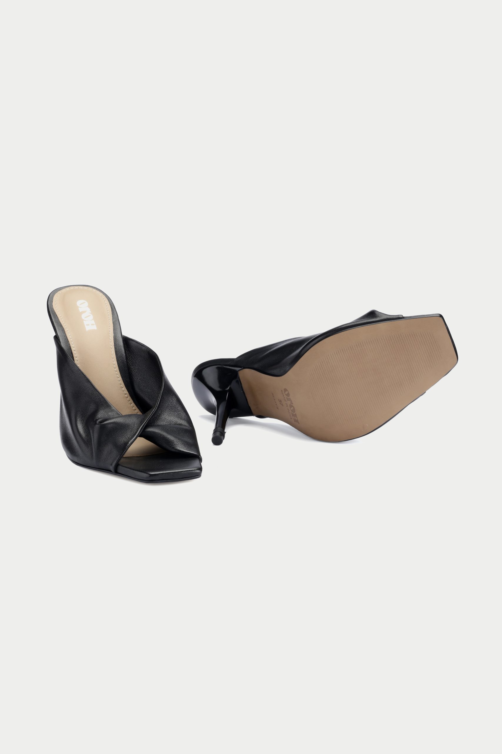 Elevate your style with the Oroh Vercelli Draped sandals These chic mules feature a dramatic draped design and a sophisticated stiletto heel.